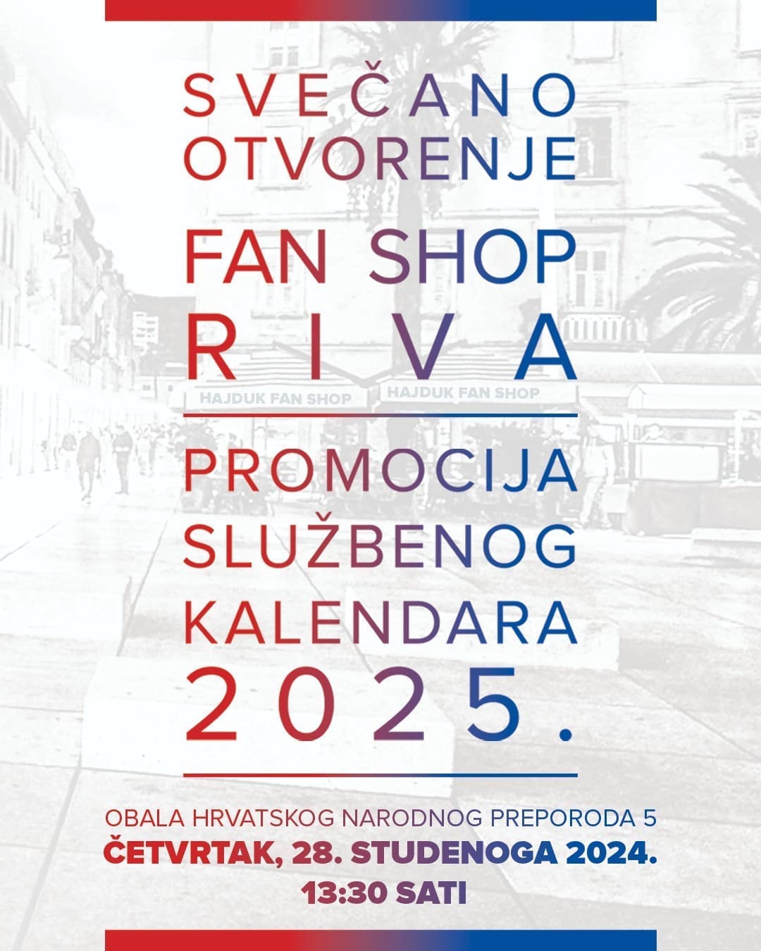Na Marmontovoj ulici u Splitu, u četvrtak, 28. studenog 2024. godine, od 13:30 sati, održat će se svečano otvorenje Fan Shopa i predstavljanje novog Hajdukovog kalendara za 2025. godinu.