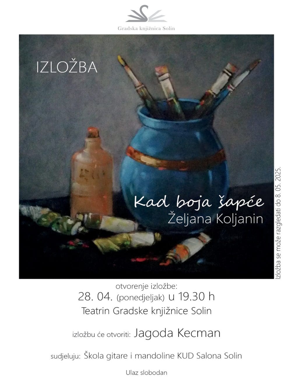 Gradska knjižnica Solin poziva na otvaranje izložbe slika „Kad boja šapće“ Željane Koljanin. Otvaranje izložbe je predviđeno za ponedjeljak, 28. travnja u 19:30 sati u Teatrinu GK Solin.