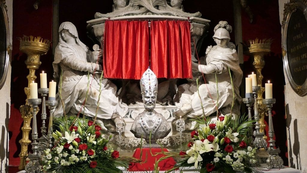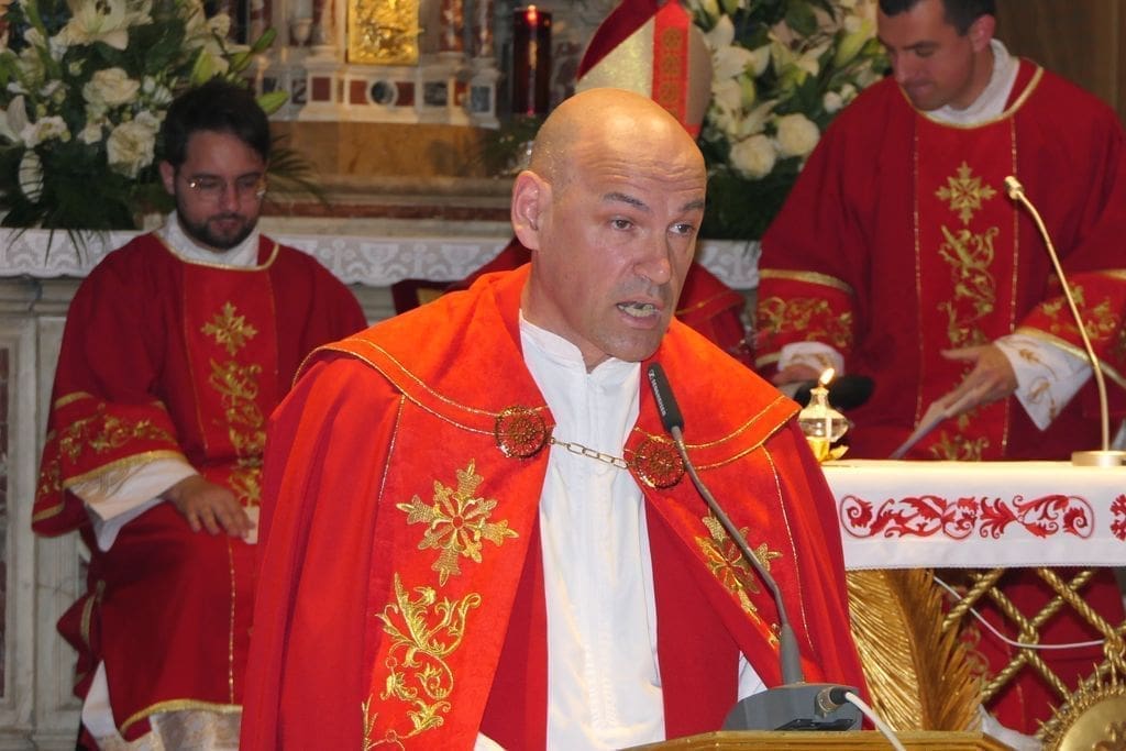 „Kako smo maloprije čuli, Crkva u Filadelfiji i njezin anđeo pohvaljeni su zbog svoje vjernosti u progonstvima i proglašeni su pobjednikom – 'Očuvao si moju riječ o postojanosti' (Otk 3,10), i 'Pobjednika ću postaviti stupom u hramu Boga moga' (Otk 3,12). U tim riječima mi prepoznajemo i danas slavimo drevnoga anđela ove splitsko-makarske, a jednoć salonitanske Crkve, Svetoga Dujma, biskupa i mučenika. Tomu je dokaz i ovo naše slavlje, a ova svečana crvena boja koju nosimo na dane mučenika predstavlja sazreli plod života u Kristu, koji je Sveti Dujam primio kao dar od Boga i kao dar ga živio darujući se u služenju svom stadu sve do smrti“, kazao je fra Domagoj. „Rođen je prije više od sedamnaest stoljeća u Siriji, darovao se u Saloni, a časnih ostataka njegova tijela evo sada među nama u Splitu. Kao i svaki spašenik Sveti Dujam građanin je nebeske domovine i novoga nebeskoga Jeruzalema, ali time nije dokinuta nego je dobila novu vrijednost njegova veza s ovim zemaljskim gradom, koji ga slavi kao svoga zaštitnika. Može li se uopće zamisliti Split bez Svetoga Duje ili Sveti Duje bez Splita? Čarobna ljepota ovoga grada uza sve njegove nesavršenosti, njegova sposobnost da trpi i da slavi, da prima i da se daruje sigurno ne bi bila ovakva da nema tako divan uzor u anđelu svoje Crkve, Svetomu Dujmu“, zaključio je fra Domagoj.