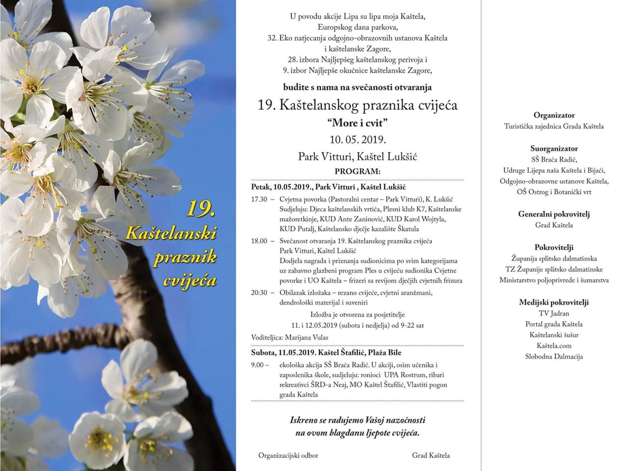 Kaštelanski praznik cvijeća otvoren je za posjetitelje od 10.5. (nakon otvaranja) do 12.5.2019. godine od 9 do 20 sati u dvorcu Vitturi, Kaštel Lukšić.