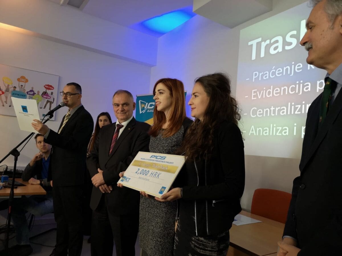 Za uređaj za praćenje razine popunjenosti spremnika za smeće – TrashTrack nagrađeni su sa 2000 kuna Petra Barać, Renato Kusanović, Antonia Senta, Mateo Vučković i Julija Županović.