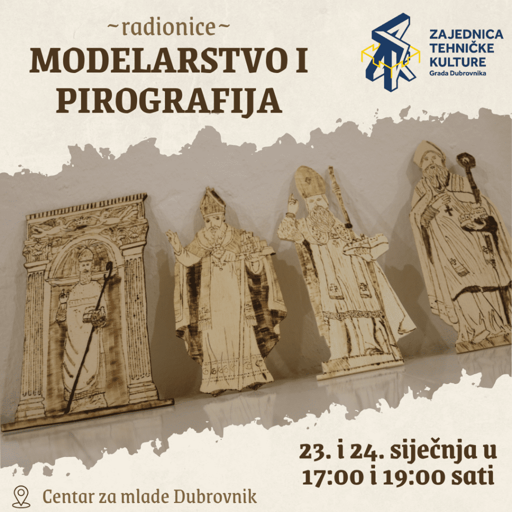 U sklopu Programa Feste sv. Vlaha i Dana Grada Dubrovnika, Zajednica tehničke kulture Grada Dubrovnika održat će četiri radionice modelarstva i pirografije u Centru za mlade Dubrovnik u utorak 23. siječnja i srijedu 24. siječnja, u 17:00 i 19:00 sati.