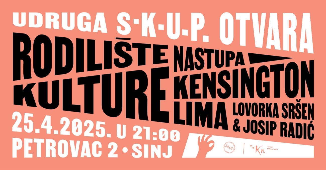 Udruga SKUP – Sinjski kulturni urbani pokret najavljuje otvorenje svog novog kulturnog prostora u Sinju – Rodilište kulture, koje će se održati u petak, 25. travnja, s početkom u 21:00 sat, na adresi Petrovac 2 (nasuprot Porezne uprave, u zgradi starog rodilišta). Na otvorenju će nastupiti Lovorka Sršen & Josip Radić (Kensington Lima).