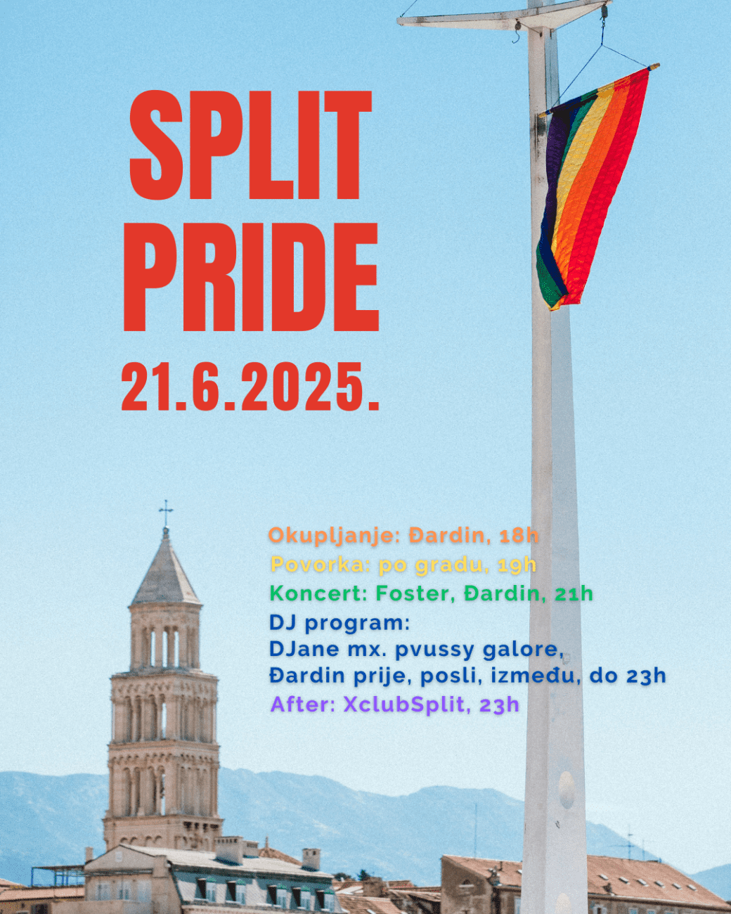 Ovu subotu 21.6. održat će se Split Pride 2025. Početak okupljanja bit će u 18:00 satu u Đardinu, a sama povorka kreće u 19:00 uobičajenom rutom kroz centar grada. Kroz povorku će nas pratiti bubnjari iz benda Klapa Klapa. Predviđeno je kraće zadržavanje na Narodnom trgu tj. Pjaci radi održavanja prigodnog govora. Tema ovogodišnjeg prajda su društveni prostori i problemi na koje LGBTIQ+ osobe nailaze u uobičajenim društvenim situacijama. Više o tome ćete čuti u govoru. Planirani povratak u Đardin je u 20:00 sati.