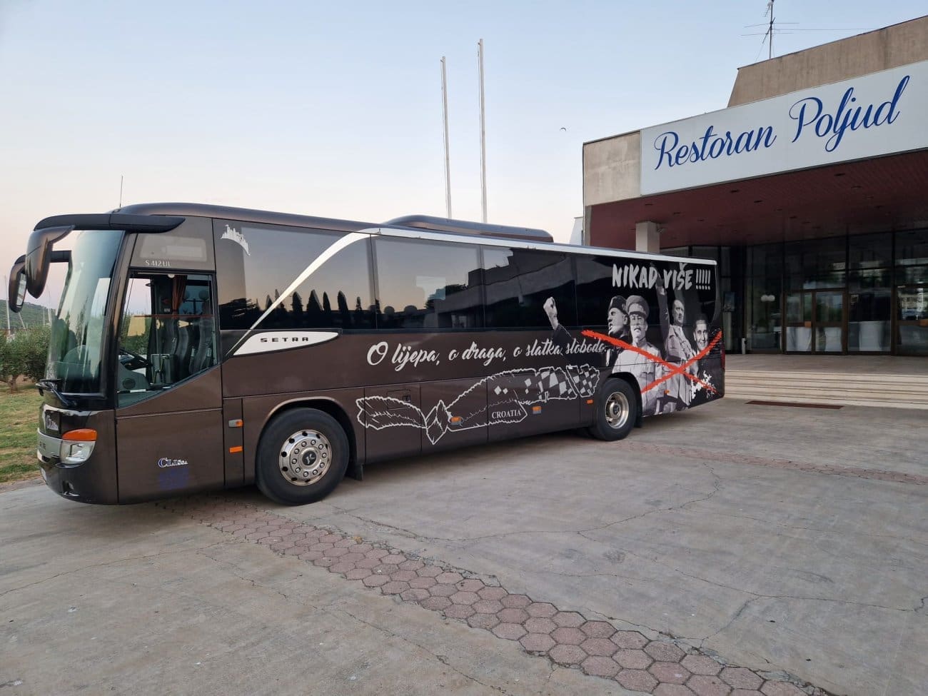 U Splitu se djeca voze autobusom na kojem su oslikani Mussolini, Hitler, Staljin i Tito. Na istom je autobusu, uz prekriženu četvorku, istaknuto i 'Nikad više' s pet uskličnika.