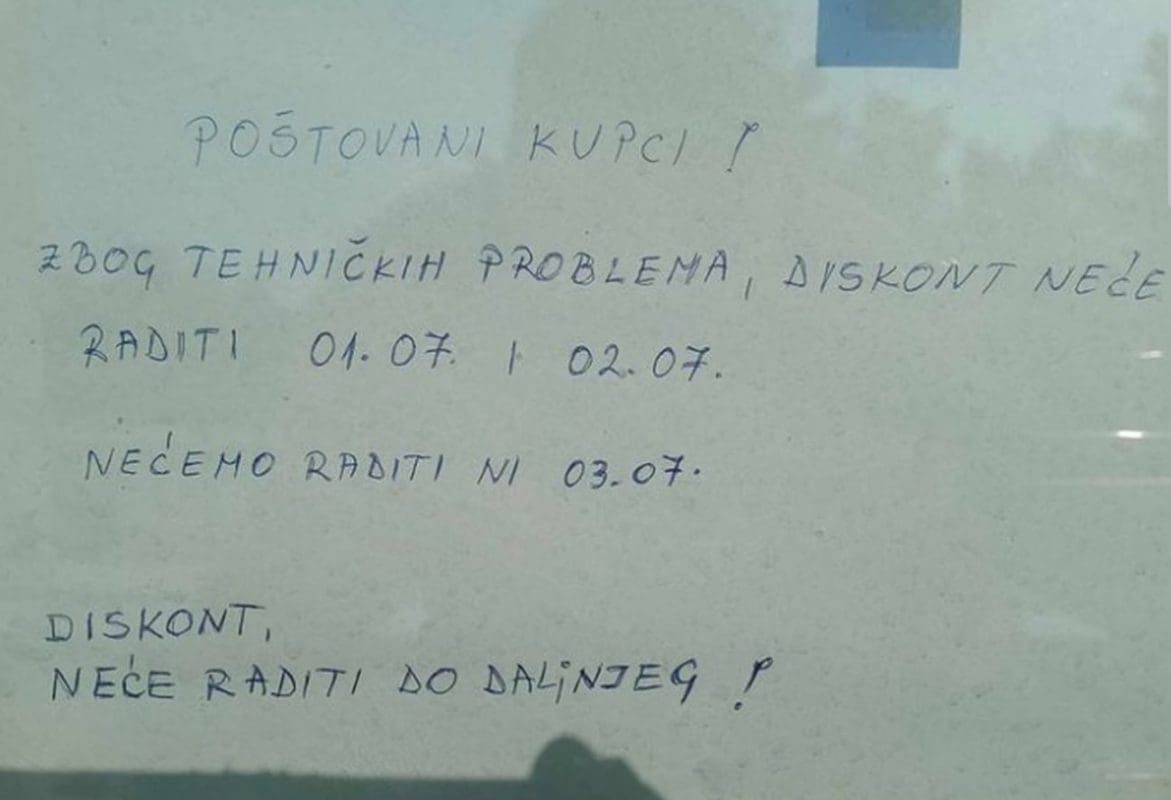 "Poštovani kupci, zbog tehničkih problema diskont neće raditi 1. srpnja kao ni 2. srpnja.