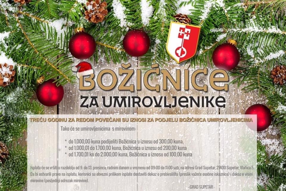 Umirovljenicima s područja Grada Supetra, čije mirovine ne prelaze iznos od 1.000,00 kn, podijelit će se Božićnica u iznosu od 300,00 kn, umirovljenicima s područja Grada Supetra, čije mirovine su od 1.000,01 kn do 1.700,00 kn, Božićnica u iznosu od 200,00 kn a umirovljenicima s područja Grada Supetra, čije mirovine su od 1.700,01 kn do 2.000,00 kn, Božićnica u iznosu od 100,00 kn - kazala je gradonačelnica Supetra Ivana Marković za Dalmacija Danas.