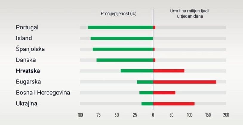 Da bismo to napravili, naravno, moramo sagledati epidemiološku situaciju u tim zemljama i usporediti je s onim najgore procijepljenima. Ograničimo se, ovom prilikom, na Europu, u kojoj imamo većinu najbolje procijepljenih zemalja na svijetu i sasvim dovoljno onih s druge strane spektra.