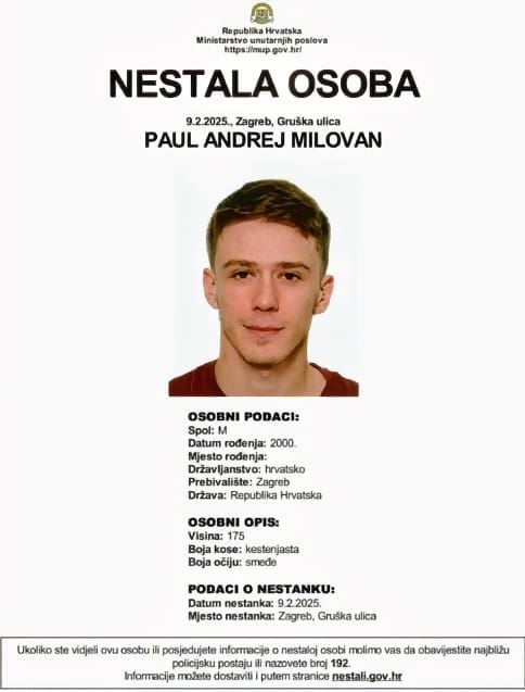 Već puna četiri dana gubi se svaki trag 24-godišnjem Zagrepčaninu Paulu Andreju Milovanu koji je posljednji puta viđen u blizini Palače pravde, točnije zagrebačkog Općinskog građanskog suda.