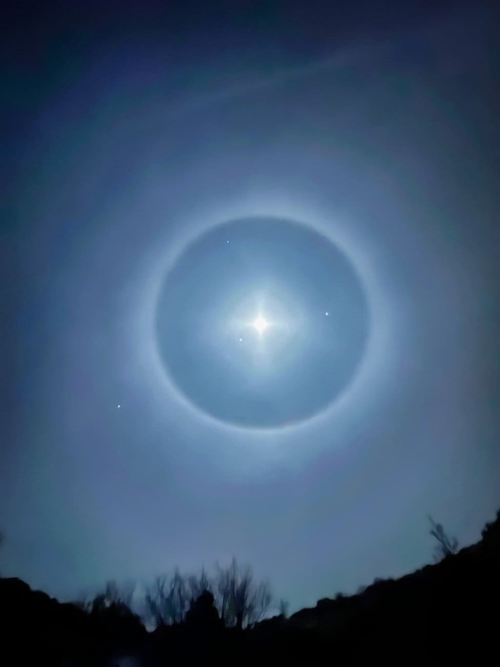 Slična pojava može se uočiti i noću oko Mjeseca, kada svjetlosni krug često djeluje zlokobno, premda je riječ o potpuno prirodnom i bezopasnom fenomenu.