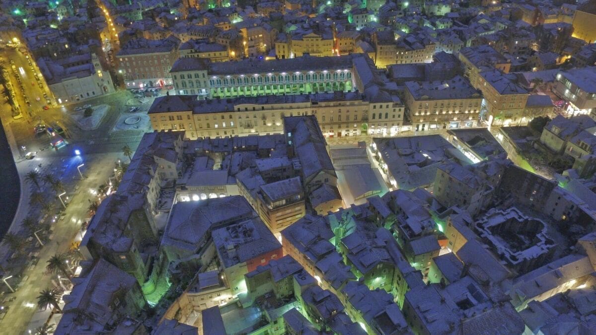 Među tisućama fotografija koje smo danas zaprimili na naš redakcijski e-mail (info@dalmacijadanas.hr), osobito su nas se dojmile fotografije Tonća Lučina koji je snimio snijegom prekrivenu Dioklecijanovu palaču u večernjim satima i to iz zračne perspektive.