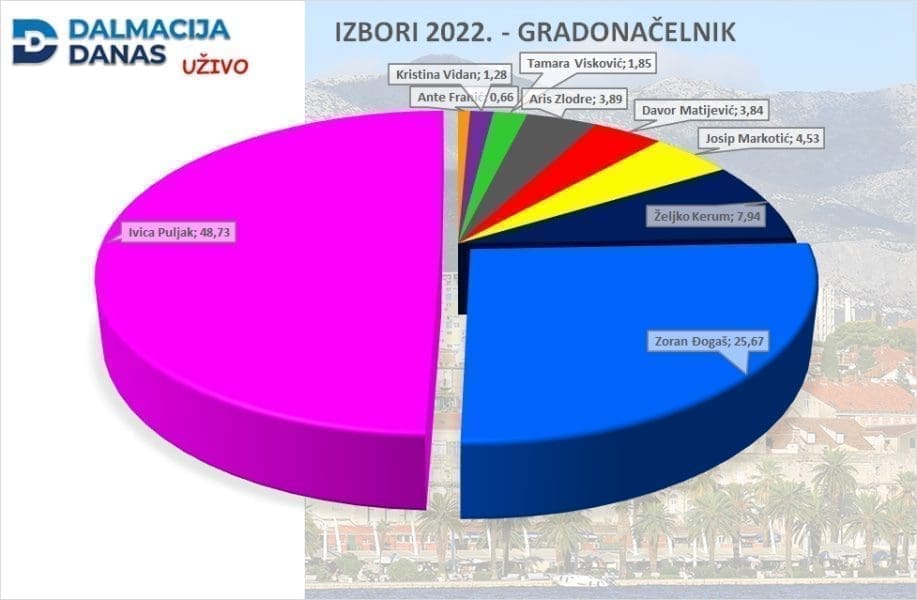 Drugi je Zoran Đogaš s 25,67%. Slijede Željko Kerum 7,94%, Josip Markotić 4,53%, Aris Zlodre 3,89%, Davor Matijević 3,84%, Tamara Visković 1,85%, Kristina Vidan 1,28% i Ante Franić 0,66%.
