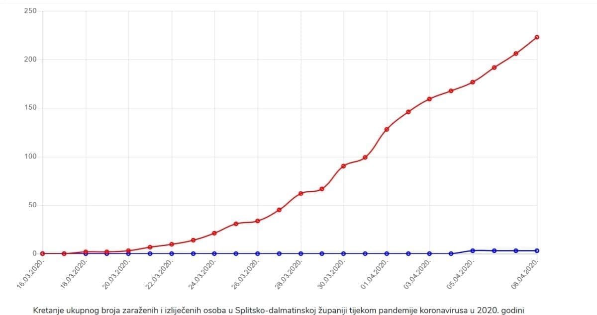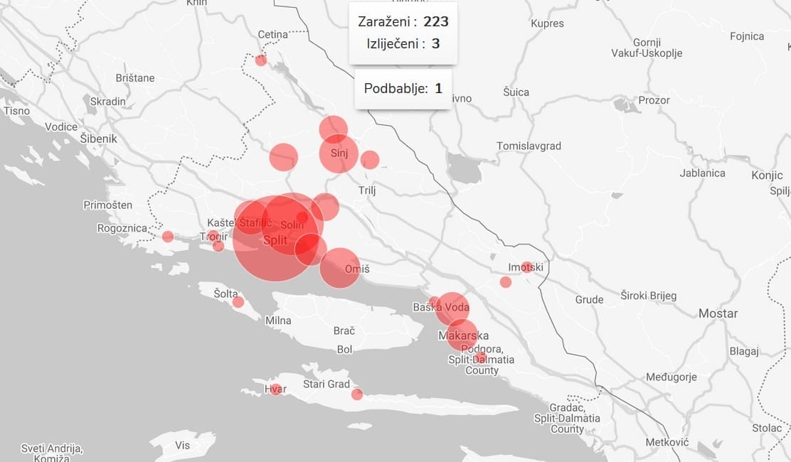 U nastavku pogledajte kako izgleda karta srednje Dalmacije s prikazom evidentiranih slučajeva po gradovima i općinama, kao i graf broja zaraženih.