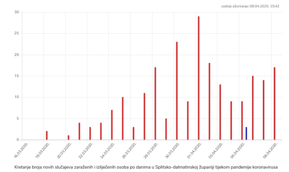 U Splitsko-dalmatinskoj županiji danas je potvrđeno 17 novih slučajeva zaraze koronavirusom, od toga iz Splita osam, iz Solina dva te iz Muća, Podstrane, Jelse, Sinja, Dugog Rata, Makarske i Podbablja po jedan.