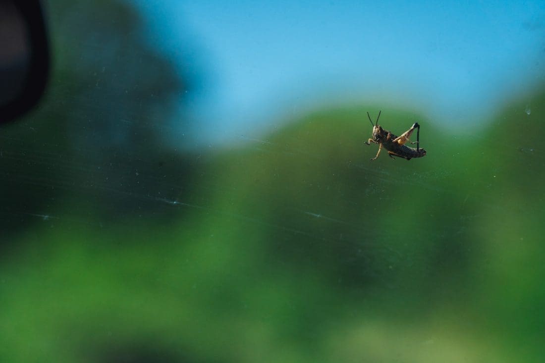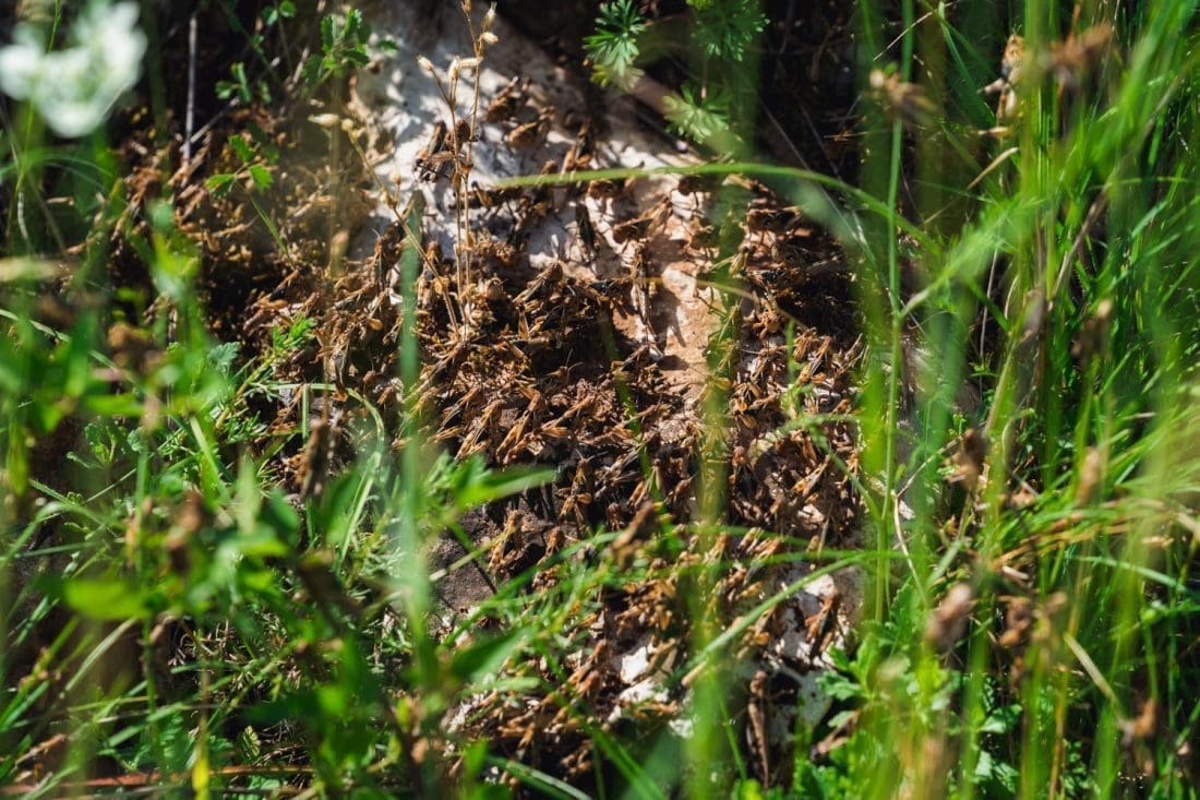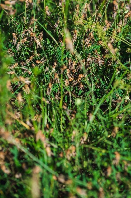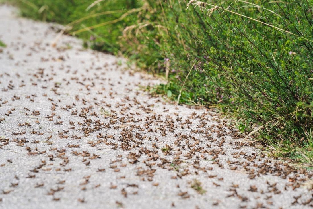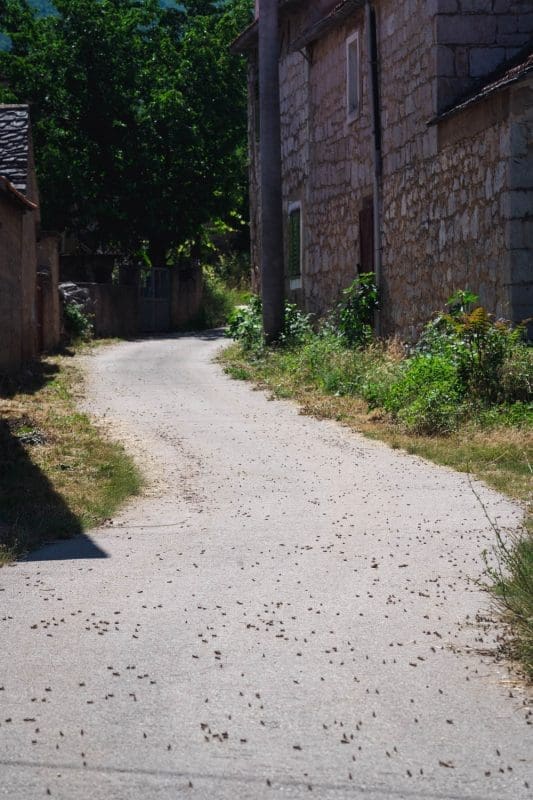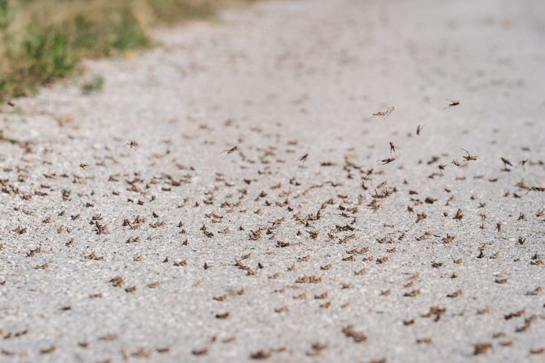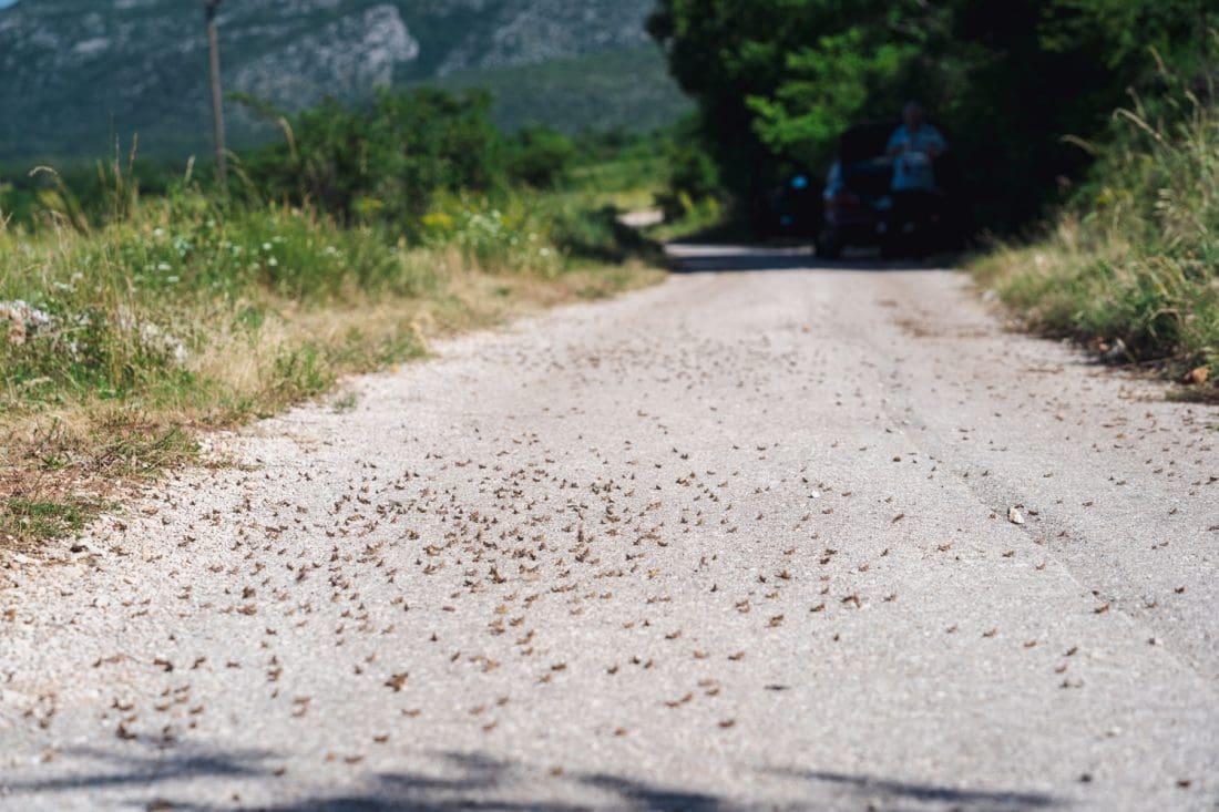 Kaže nam mještanin da su tako skakavci jučer navečer zauzeli 6 metara ceste koja se proteže kod obližnjeg susjedstva, između dvije livade.