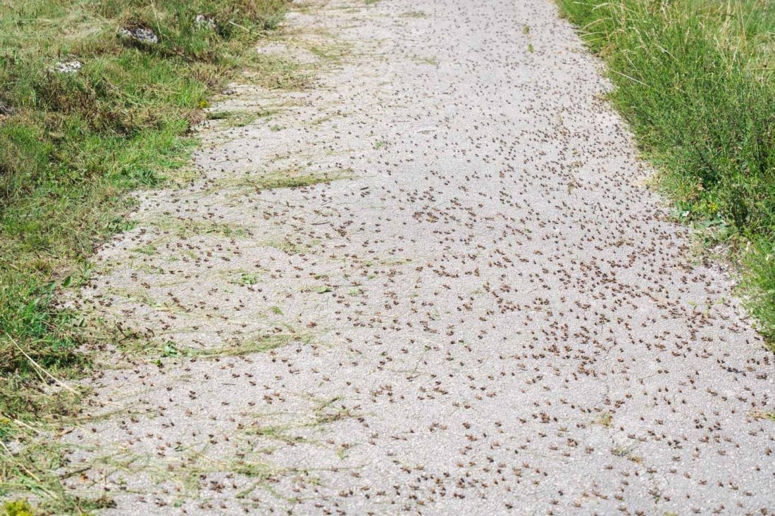 Ne znamo koji su stvarni razmjeri ove prirodne pojave, ali primijetili smo da se kreću uz cestu i po livadama, dakle izbjegavaju više prepreke jer nemaju krila. Sretali smo ih uz cestu uzduž barem dva-tri kilometra. Tko zna koliko su se raširili lijevo i desno po okolnim livadama i zaseocima.