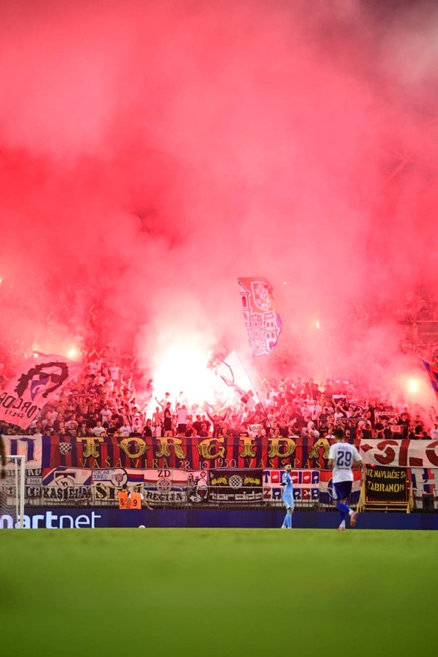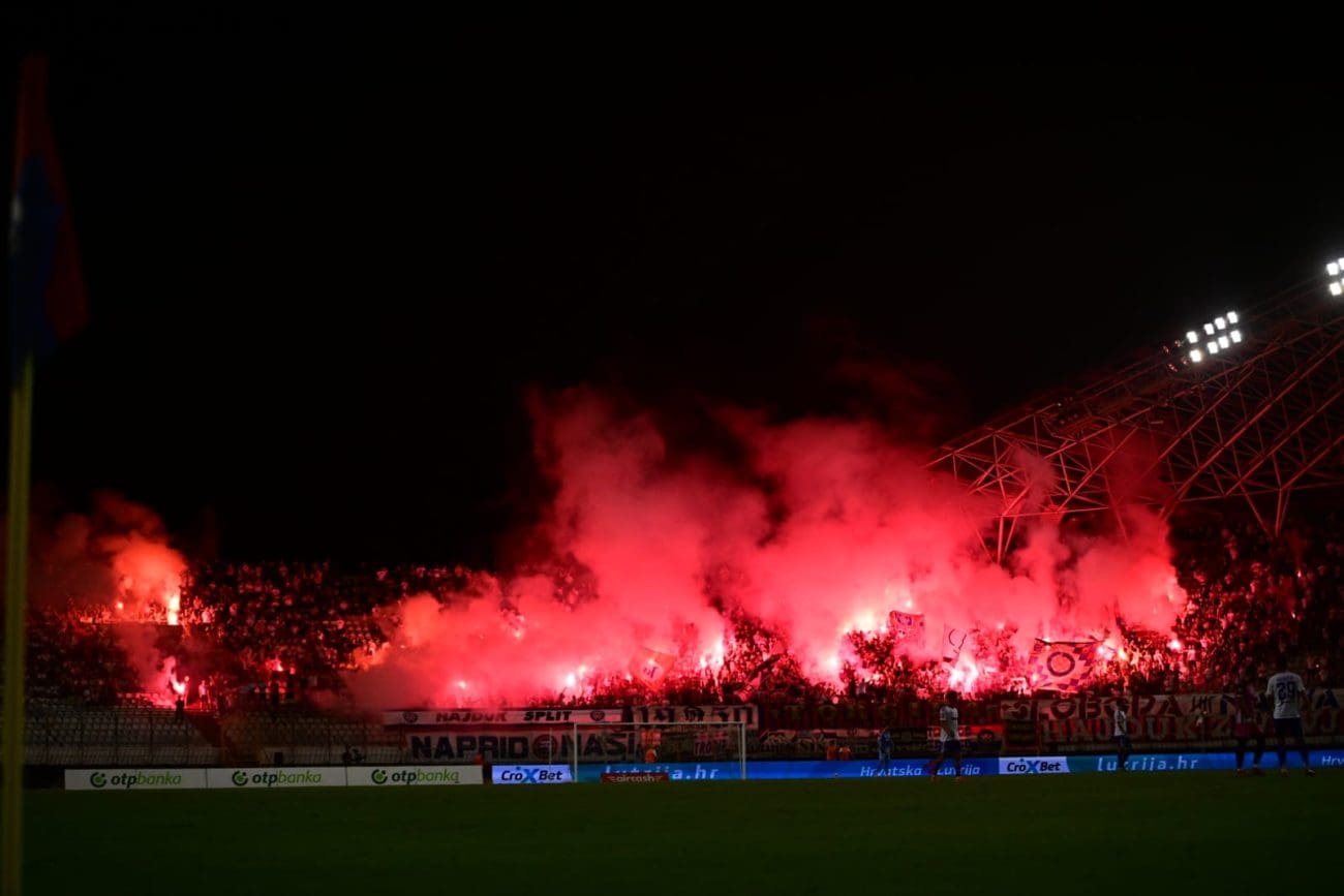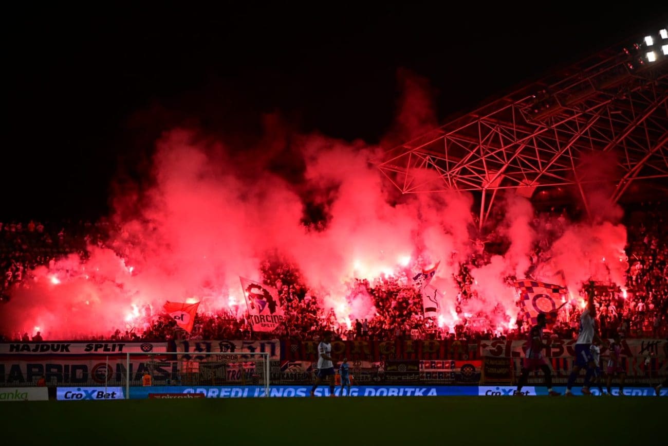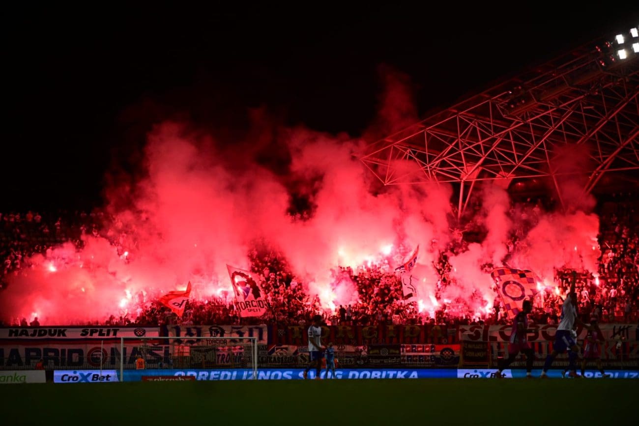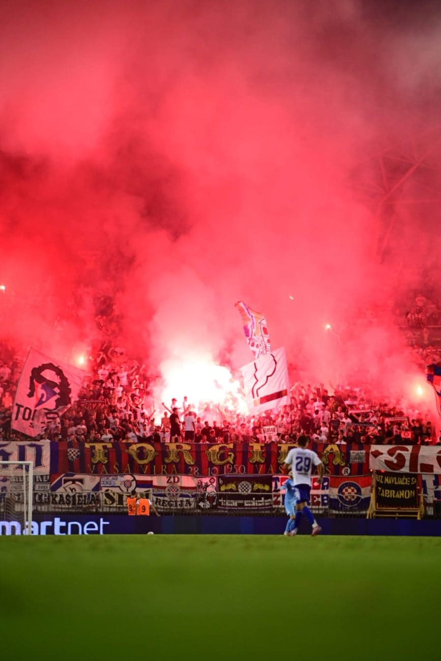 U 70. je minuti Torcida tradicionalno pripremila svoj pirotehnički arsenal, Sjever je pocrvenio od baklji, a onda i jedva vidio od dima. Dimna se zavjesa potom protegnula do zapada prema jugu, a igra je bila zaustavljena.