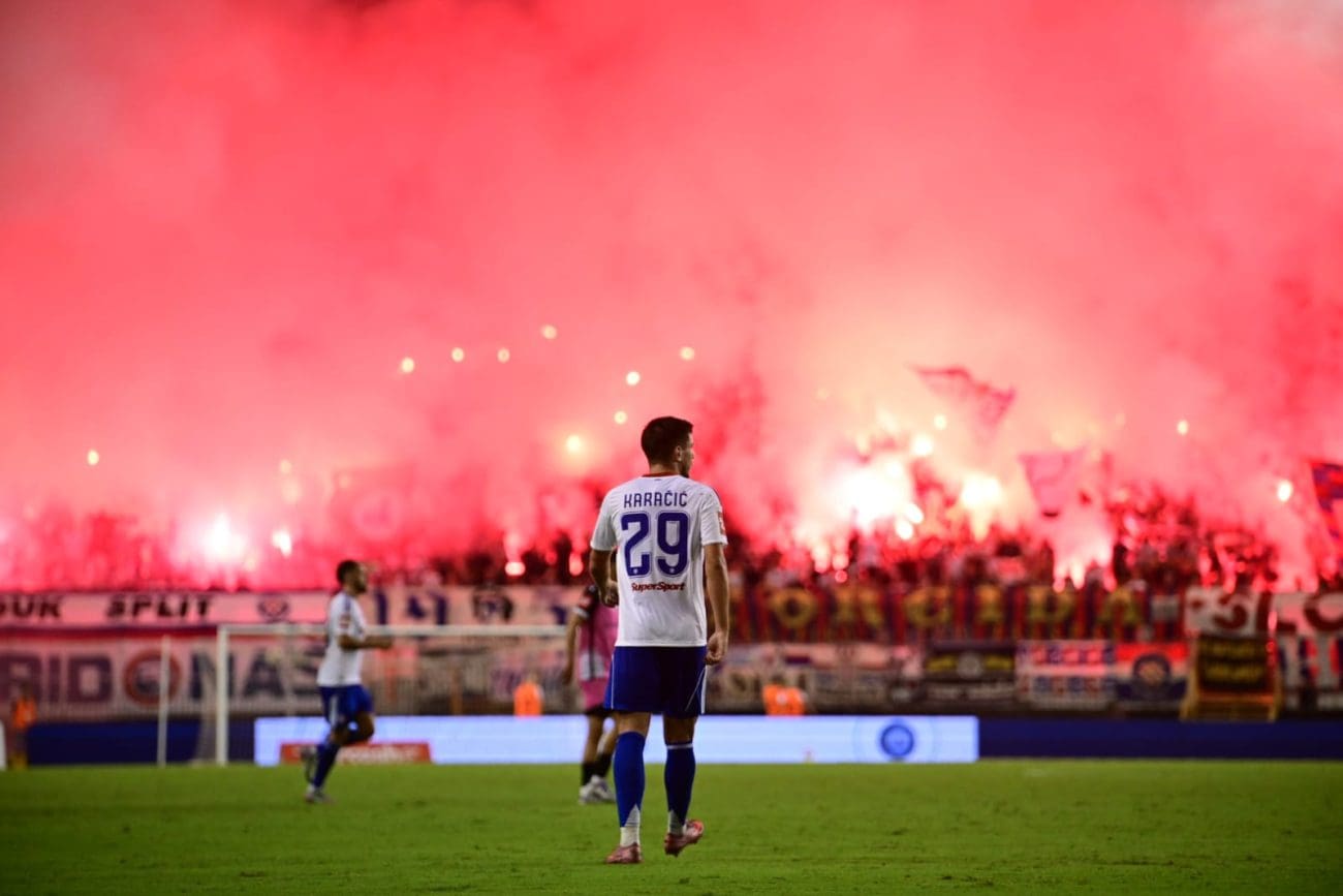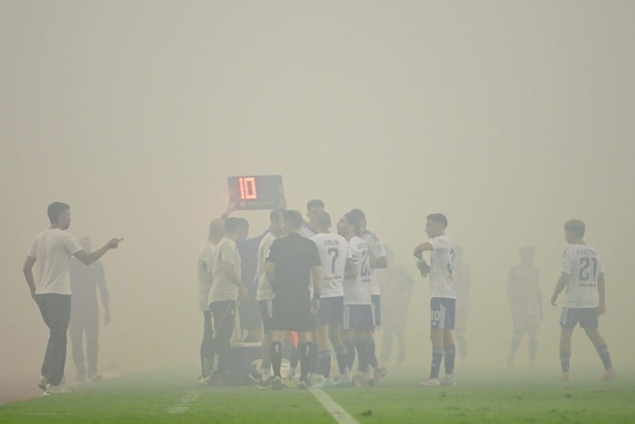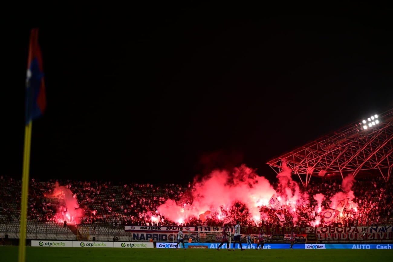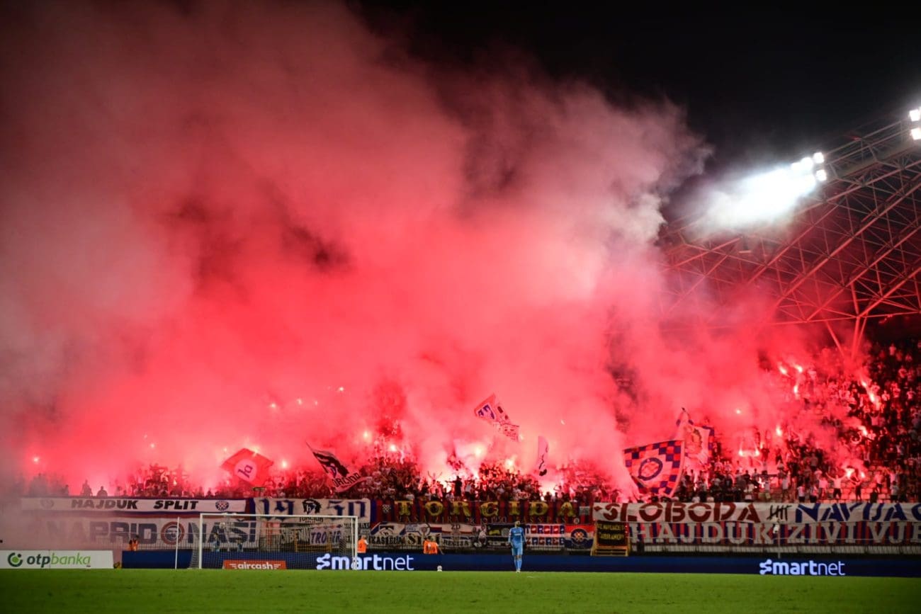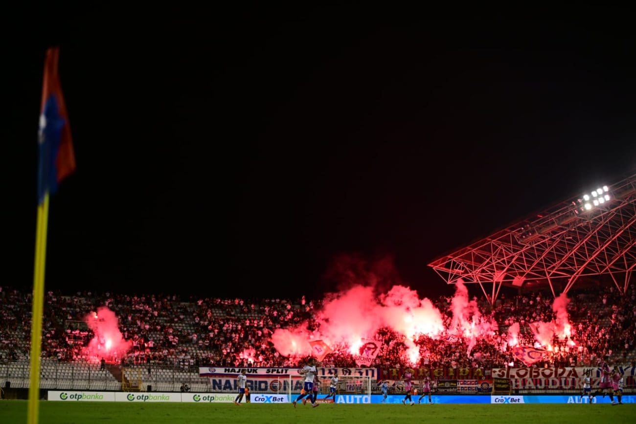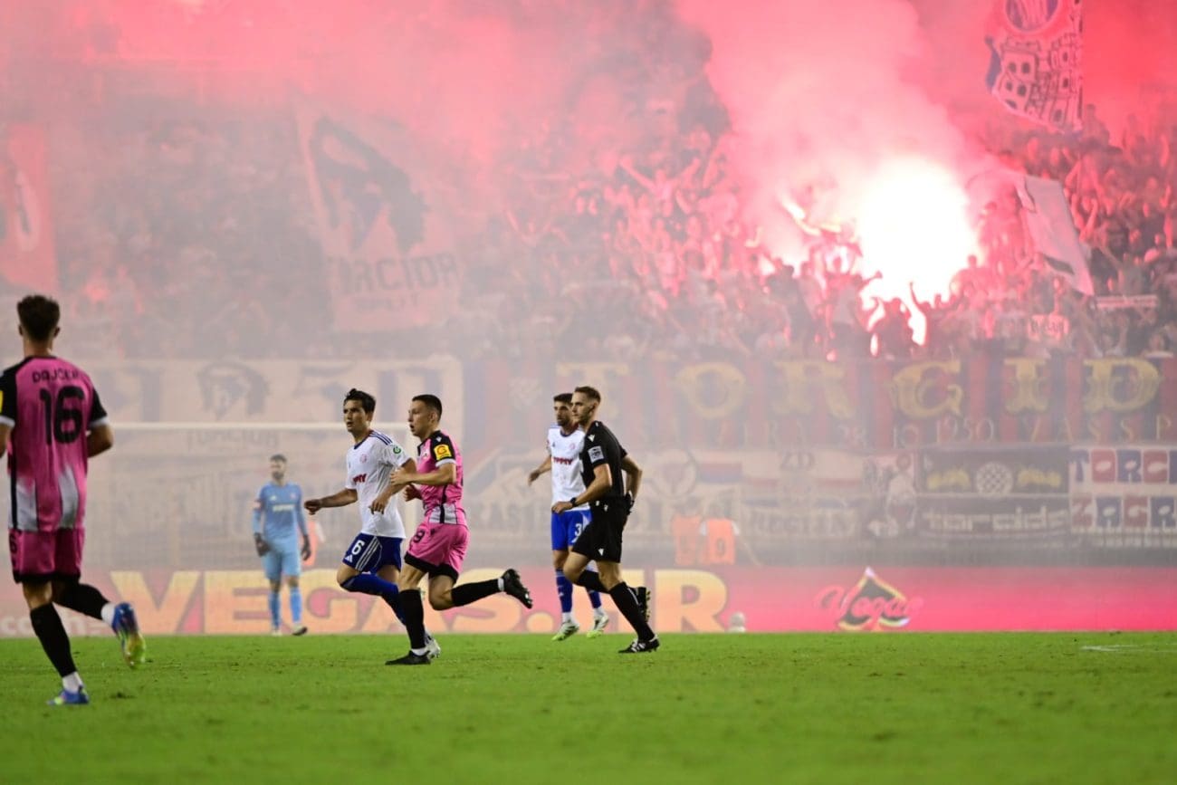 U 70. je minuti Torcida tradicionalno pripremila svoj pirotehnički arsenal, Sjever je pocrvenio od baklji, a onda i jedva vidio od dima. Dimna se zavjesa potom protegnula do zapada prema jugu, a igra je bila zaustavljena.