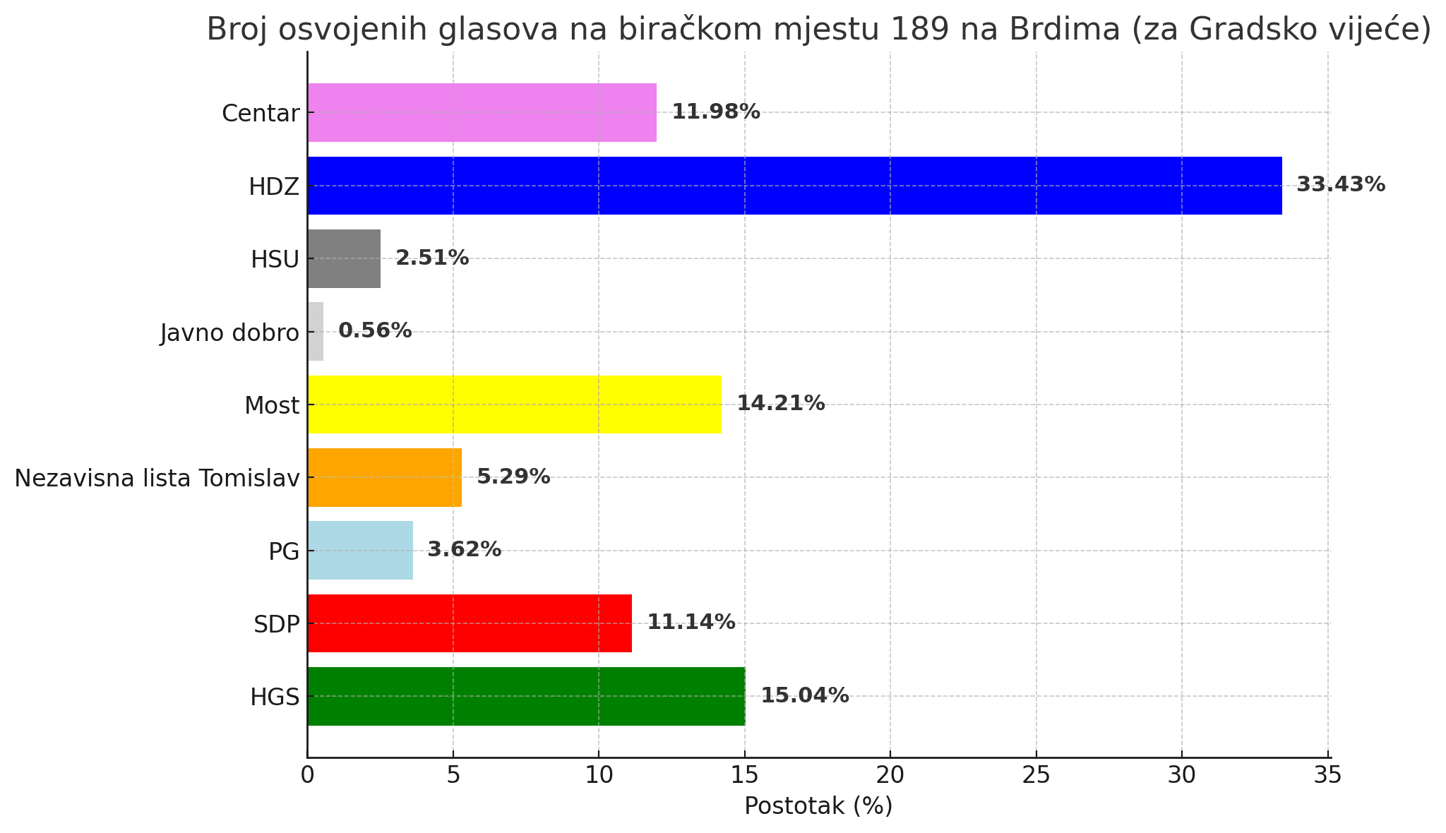 Na biračkom mjestu broj 189 na Brdima poznati su rezultati izbora za Gradsko vijeće Splita, a oni pokazuju jasnu dominaciju liste HDZ-a, koja je osvojila 120 glasova, odnosno 33,43 % svih važećih i nevažećih listića.