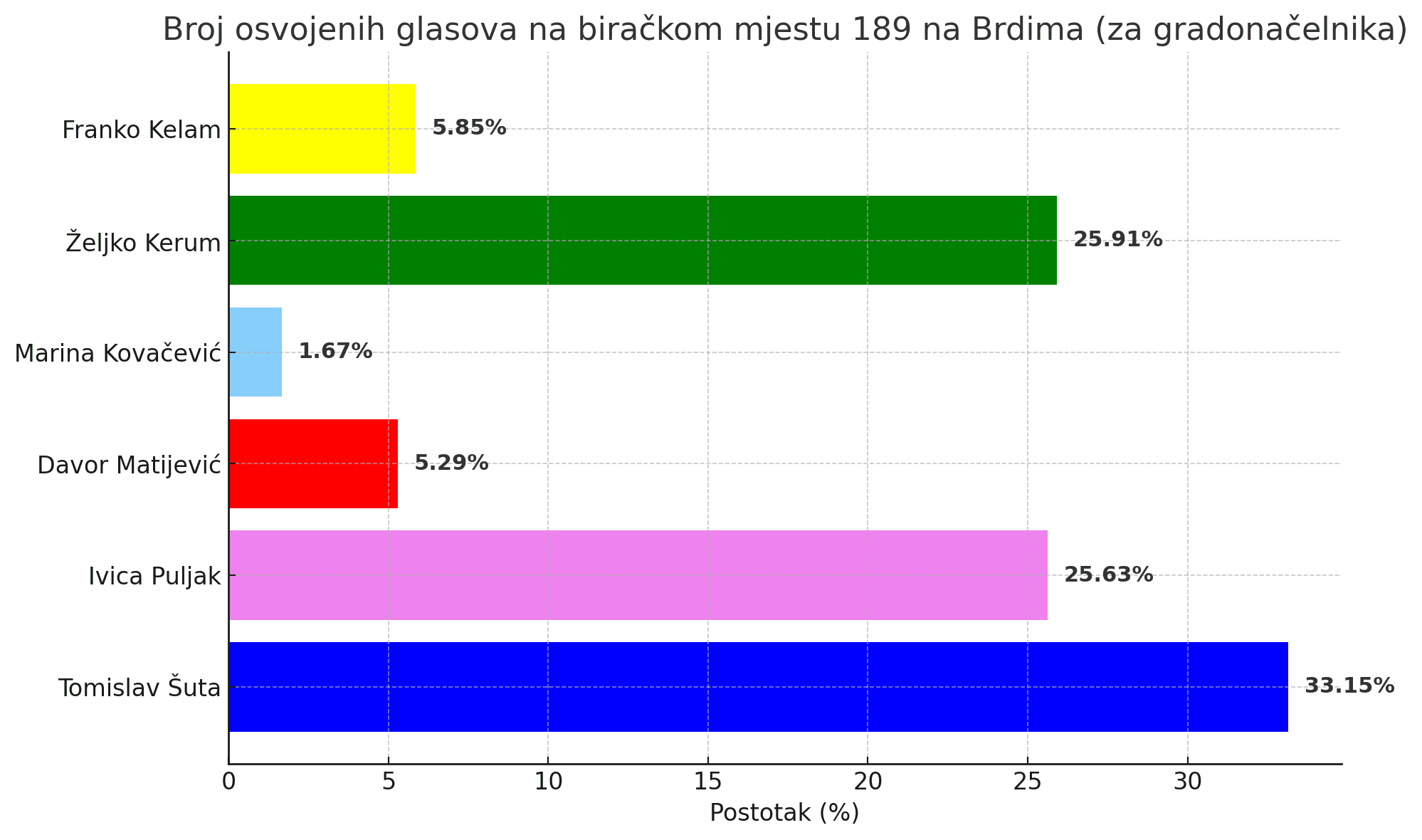Na biračkom mjestu broj 189 na Brdima zabilježeni su rezultati koji značajno odstupaju od izlazne ankete za cijeli Split. Najviše glasova osvojio je Tomislav Šuta (HDZ i partneri) sa 119 glasova, što čini 33,15 % od ukupnog broja važećih i nevažećih listića. Slijede Željko Kerum s 93 glasa (25,91 %) i Ivica Puljak s 92 glasa (25,63 %), što ukazuje na gotovo izjednačenu podršku na ovom biračkom mjestu.