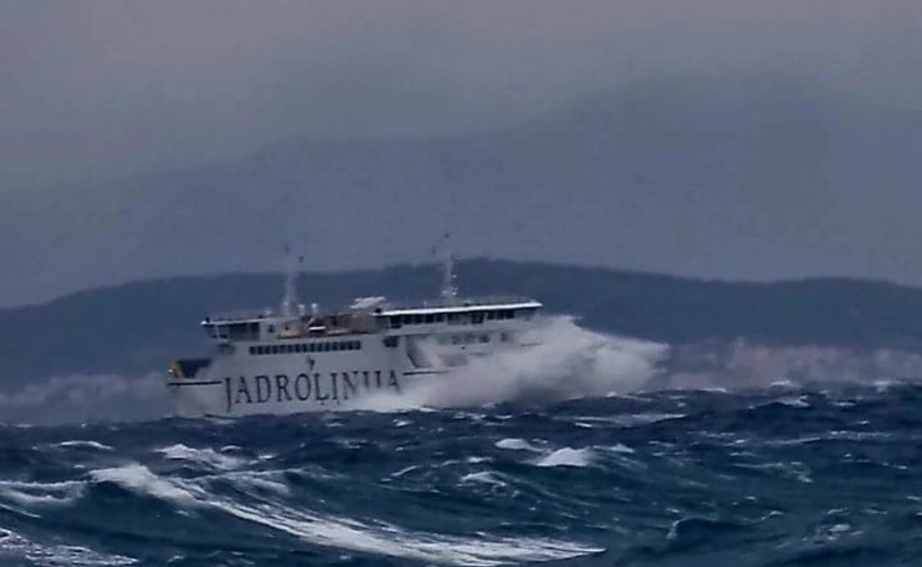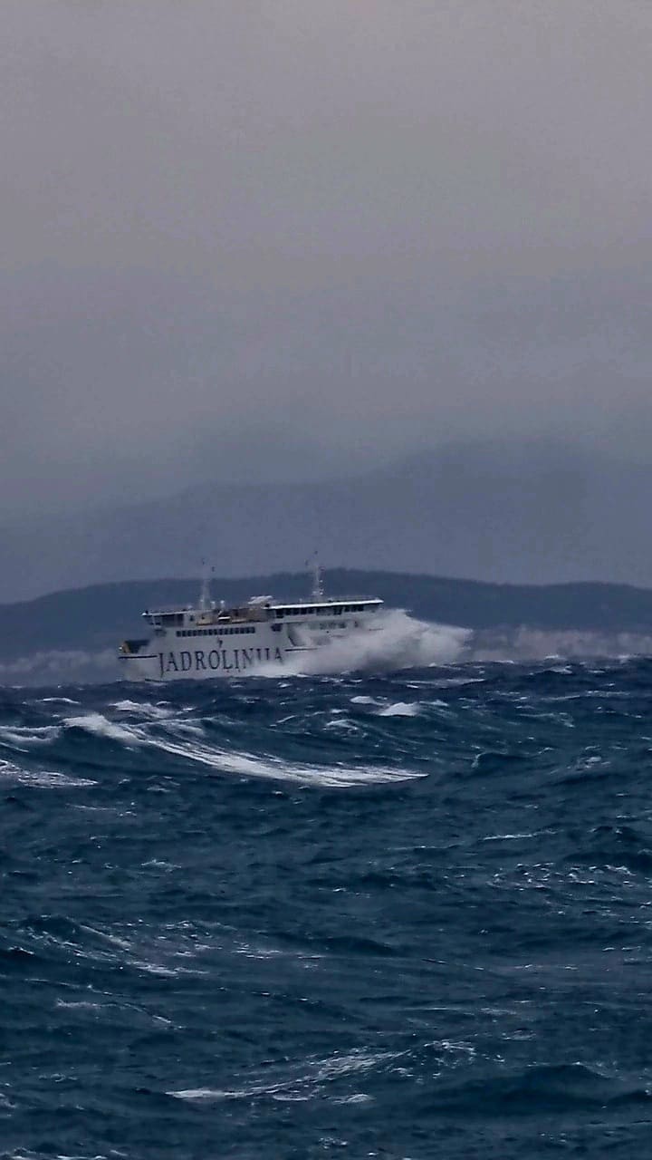 Bura je stvorila probleme u cestovnom i pomorskom prometu, a fotografija prikazuje borbu trajekta s udarima vjetra i valovima.
