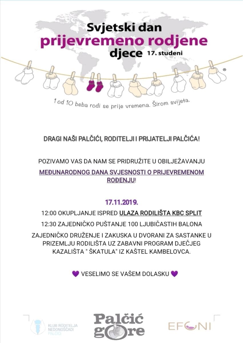 Pridružimo im se i mi u Splitu, obucimo nešto ljubičasto i podignimo palac gore za Palčiće! I ove godine zgrada splitske gradske uprave – Banovina – zasvijetlit će ljubičastom bojom, a sve s ciljem podizanja svijesti javnosti o problemima prerano rođene djece i njihovih roditelja. Tako će i Grad Split hrabrim mališanima uveličati njihov dan.