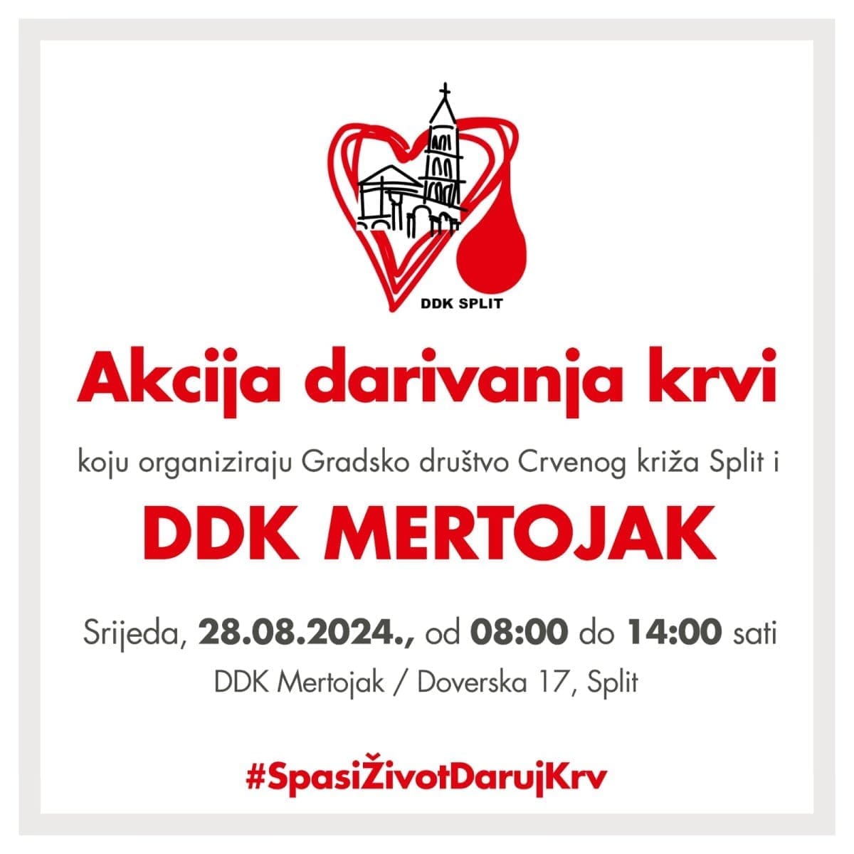 U srijedu, 28. kolovoza od 8 do 14 sati u prostorijama Gradskog kotara Mertojak u ulici Doverska 17, Crveni križ Split i DDK Mertojak organiziraju terensku akciju darivanja krvi na koju pozivaju građane da se odazovu u što većem broju.