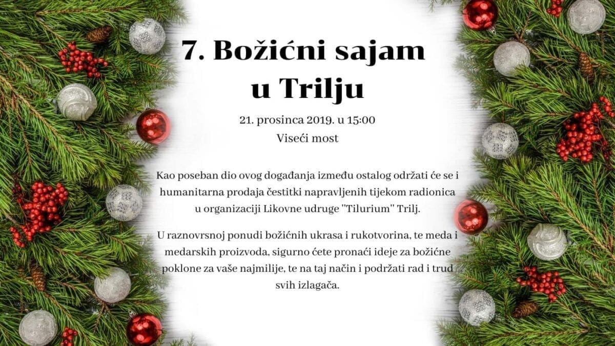 Turistička zajednica grada Trilja ORGANIZIRA 7. BOŽIĆNI SAJAM koji će se održati 21. prosinca 2019. godine s početkom od 15 sati kraj Visećeg mosta.