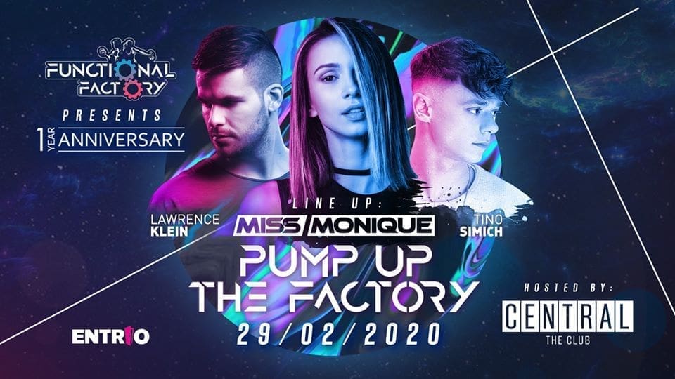 Functional Factory proslavit će prvu godišnjicu rada s organizacijom Eventa, PUMP UP THE FACTORY. Po prvi put u Hrvatskoj gostovat će prelijepa i talentirana DJ Miss Monique. Uz muško pojačanje DJ Lawrence Klein i DJ Tino Simich.