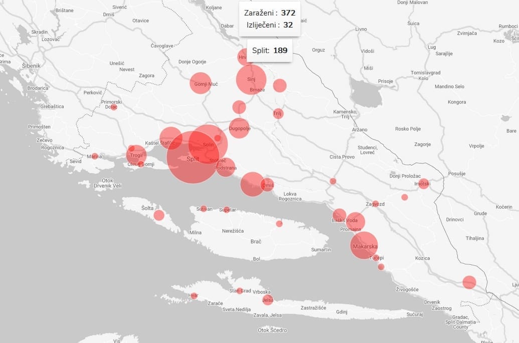 Grad Zagreb prednjači po broju oboljelih osoba, evidentirano ih je 421. No nastavali li se aktualni trend, Splitsko-dalmatinska županija mogla bi postati prva po broju oboljelih. Primjerice, od 37 novozaraženih u državi tijekom srijede, čak 20 ih je iz Splitsko-dalmatinske županije, a od toga velika većina iz Splita.