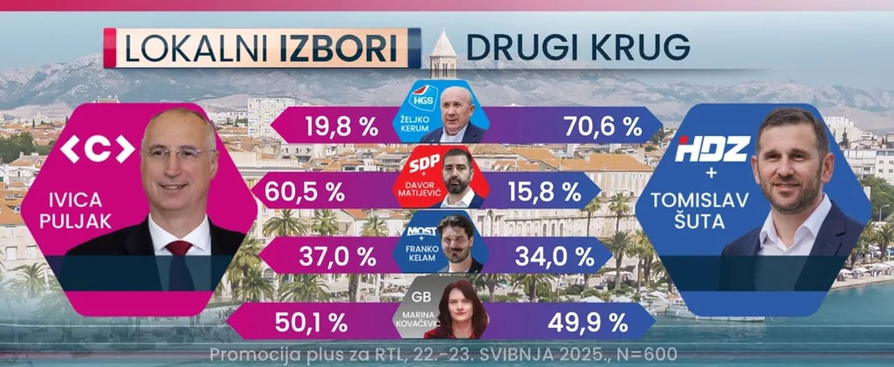 Jučer objavljeno RTL-ovo istraživanje daje Ivici Puljku (Centar) 46,2 %, a HDZ-ovu Tomislavu Šuti 44,4 %. Razliku od 1,8 bodova “pojede” standardna pogreška pa oba tabora, s pravom tvrde da su favoriti. Neodlučnih je 6,5 %, a anketa navodi da su to pretežito žene – Splićanke koje ili tek razmišljaju izaći na birališta ili još važu kome dati glas.