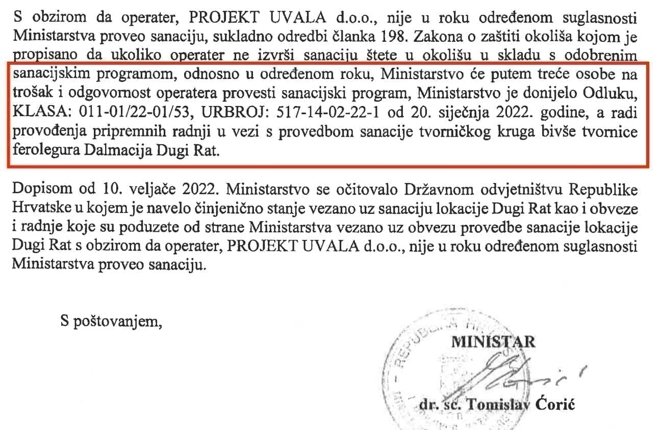 Ministarstvo će putem treće osobe, a na trošak Projekta Uvala d.o.o., provesti sanacijski program. Odluku je donijelo 20. siječnja 2022. radi provođenja pripremnih radnji u vezi s provedbom sanacije.