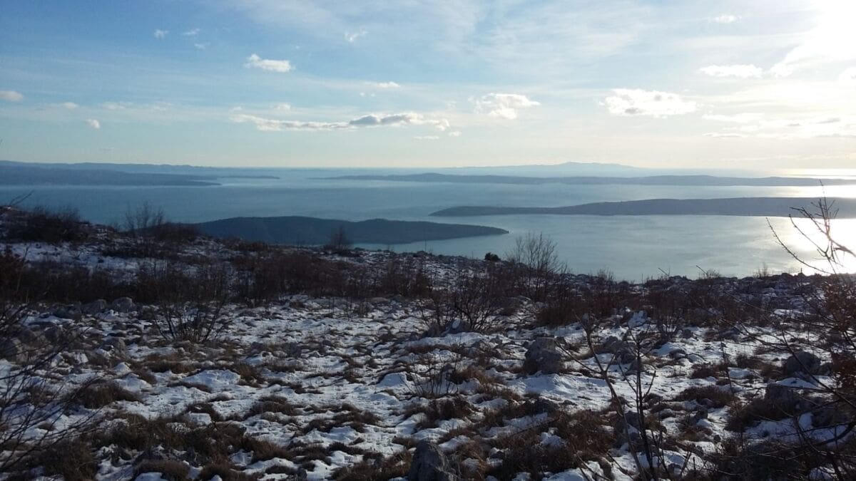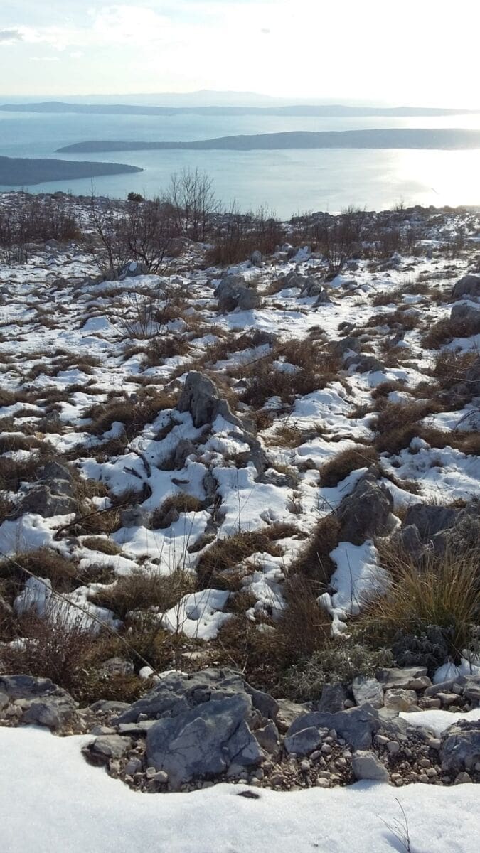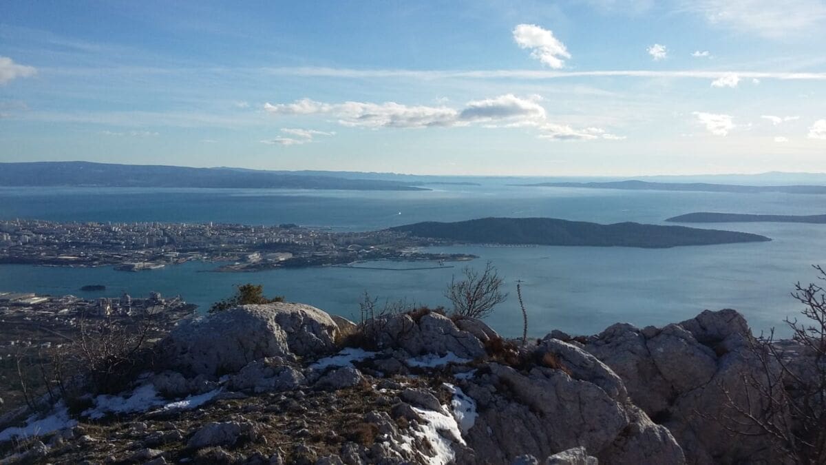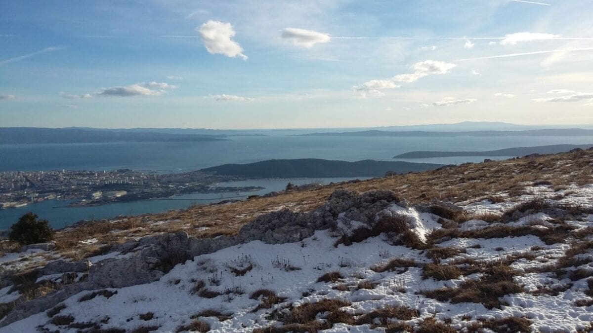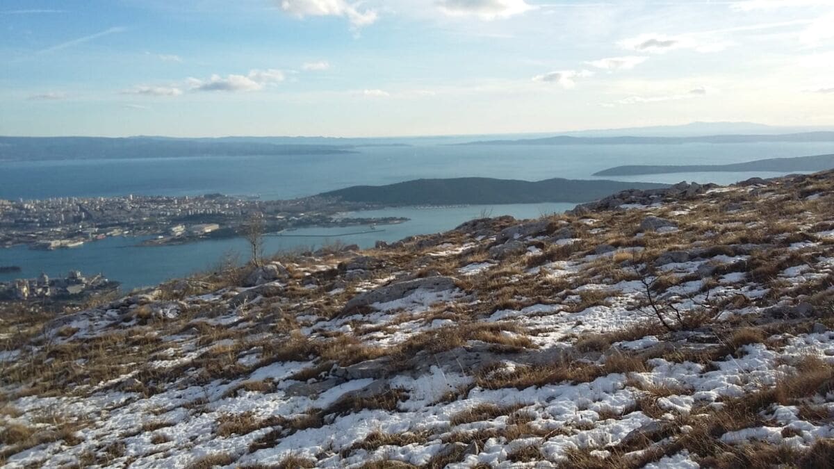 Desetak centimetara snijega i dalje ima oko kozjačkog vrha Sv. Luka, odakle "puca" prekrasan pogled na Split, Kaštelanski zaljev, Kaštela, Solin, Trogir i otoke.
