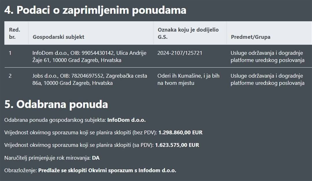 Tvrtka InfoDom d.o.o. iz Zagreba ponudila je svoje usluge za 1.298.860 eura, dok je Jobs d.o.o. iz Zagreba dao ponudu od samo 351.837 eura. Međutim, druga ponuda izazvala je posebnu pažnju – uz značajno niži iznos, dostavljen je i nesvakidašnji komentar: "Oderi ih Kumašine, i ja bih na tvom mjestu".