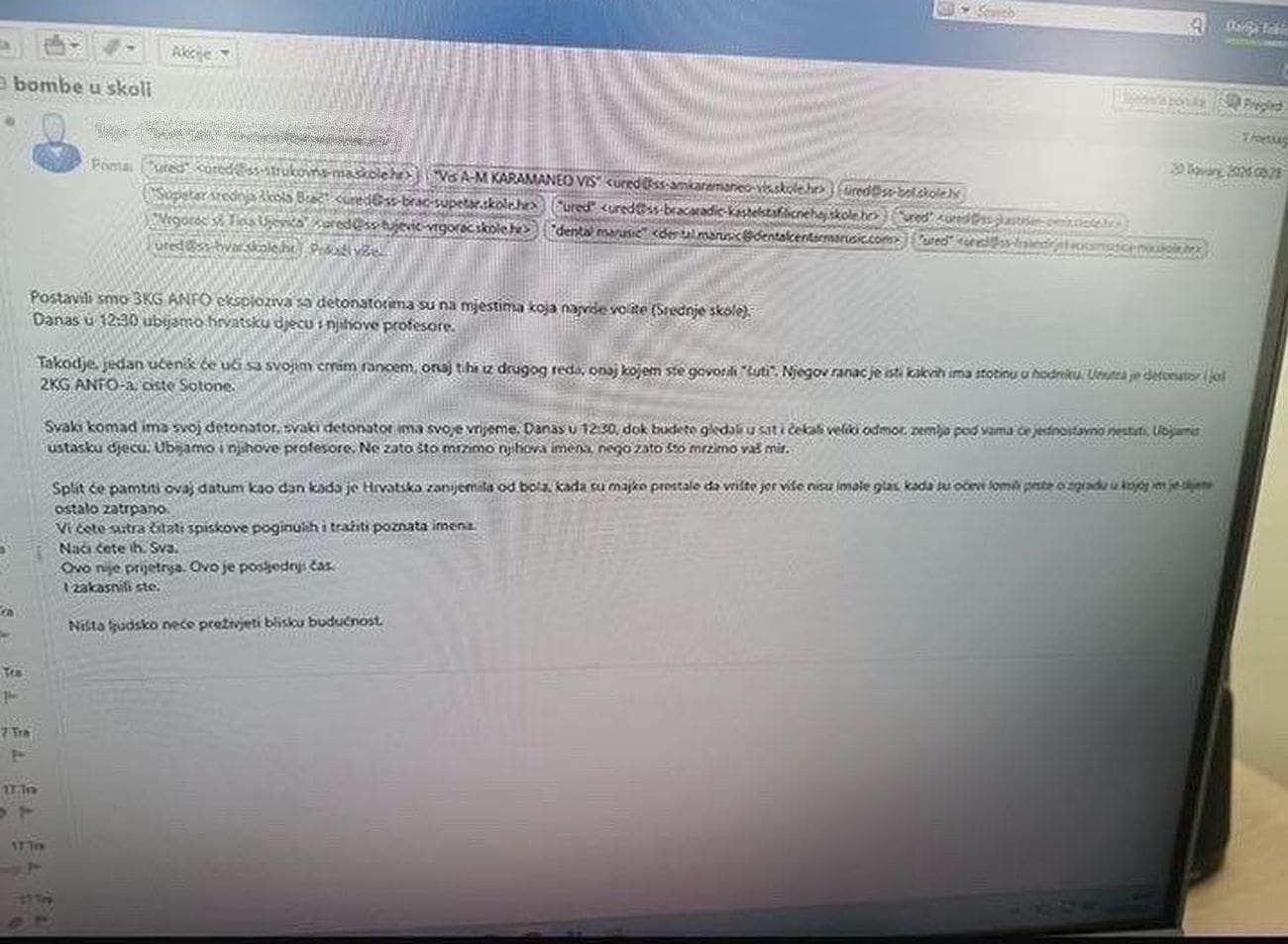"Danas u 12.30 ubijamo hrvatsku djecu i njihove profesore. Split će pamtiti ovaj datum kao dan kada je Hrvatska zanijemila od bola, kada su majke prestale da vrište jer više nisu imale glas, kada su očevili lomili prste o zgradu u kojoj im je dijete ostalo zatrpano. Vi ćete sutra čitati spiskove poginulih i tražiti poznata imena. Naći ćete ih. Sva. Ovo nije prijetnja. Ovo je posljednji čas. I zakasnili ste. Ništa ljudsko neće preživjeti blisku budućnost", jeziva je poruka poslana na adrese brojnih škola.