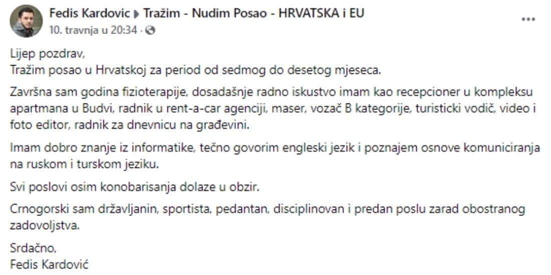 Nevjerojatan oglas osvanuo je na jednoj od hrvatskih Facebook stranica (Tražim - Nudim Posao - HRVATSKA i EU) gdje mnogi građani traže ili nude posao. Naime, objava mladog Crnogorca očito je sve oduševila, a sudeći prema komentarima Facebook korisnika, mnogi mu pružaju podršku.