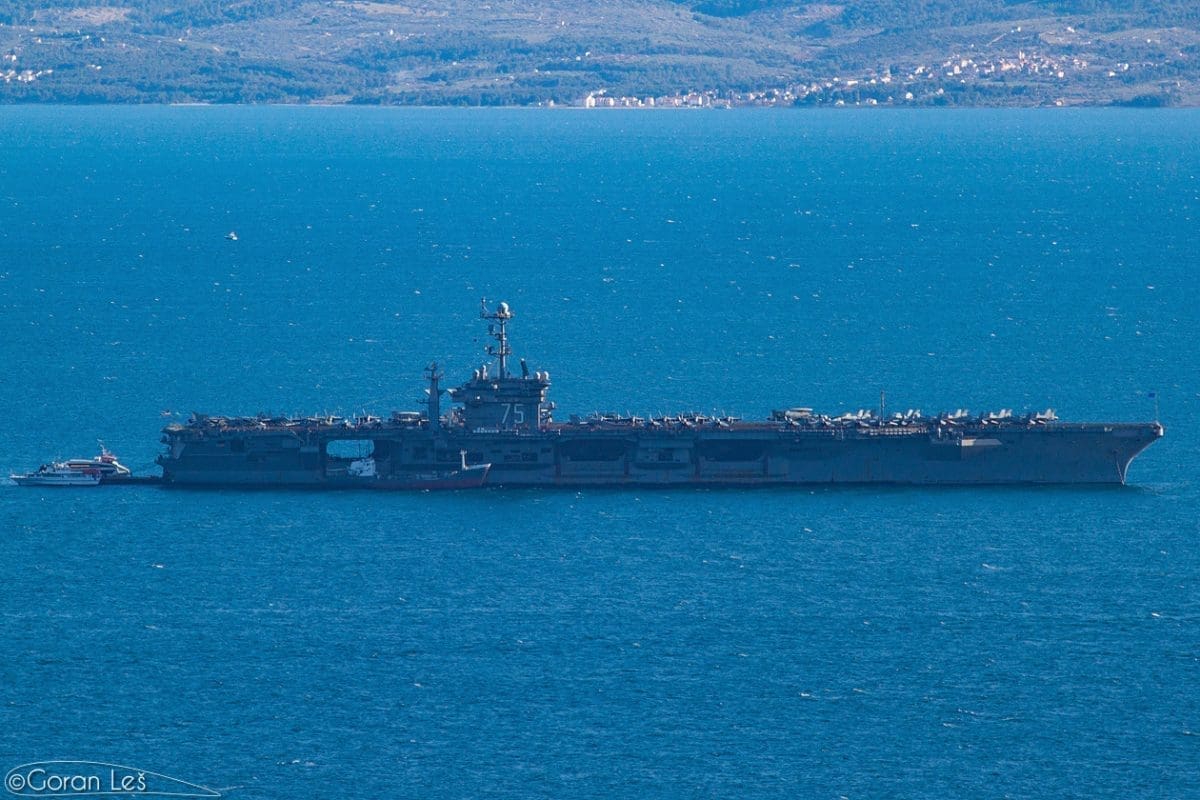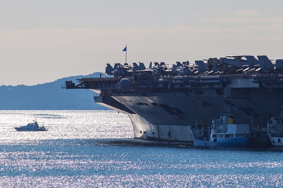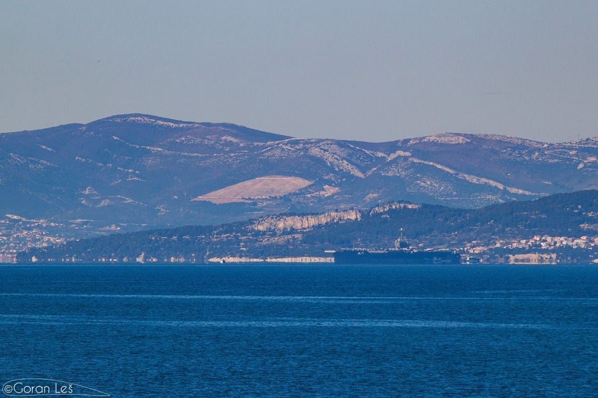 Nosač aviona usidren je između Brača i Splita, kao i prije sedam godina kada je bio u posjetu Hrvatskoj, jer po svojim gabaritima ne može uploviti u splitsku luku.