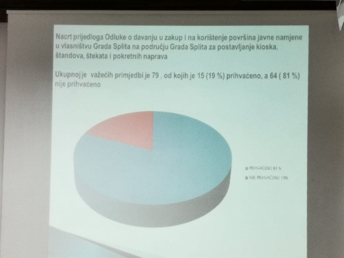 Ipak, iduća točka, "Prijedlog Odluke o načinu i uvjetima postavljanja kioska, štandova, opreme štekata, pokretnih naprava i dr. na površinama javne namjene na području grada Splita" konačno je izglasana elektroničkim putem i to jednoglasno.