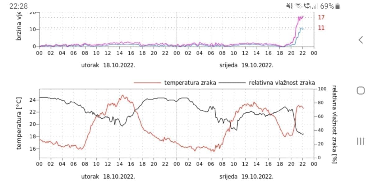 Umjerena bura puše večeras uzduž obale, a na dubrovačkom području se najbolje može vidjeti njen fenski učinak. Tako je oko 18 sati temperatura pala na 18°C, a nakon što je zapuhala bura olujnim udarima, temperatura je porasla na gotovo 23°C.