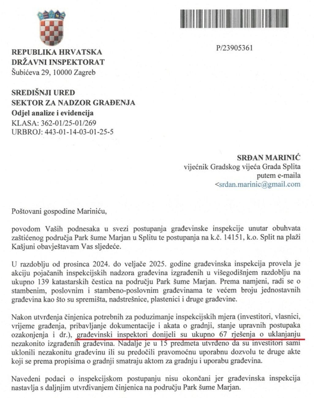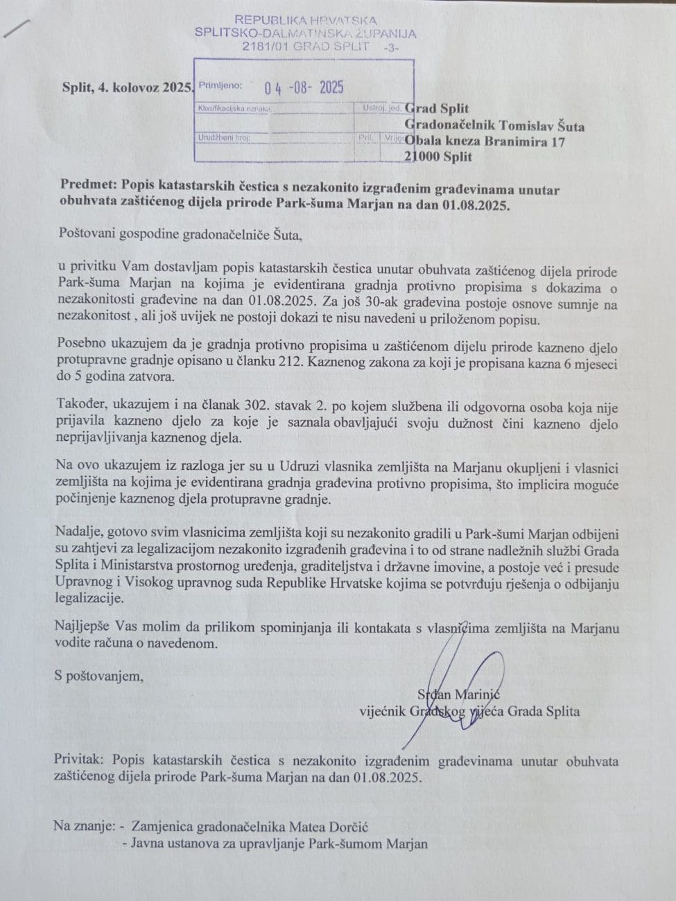 Obavijest gradonačelniku Splita gosp. Šuti: O razmjerima bespravne gradnje i broju bespravnih graditelja službeno je obaviješten i gradonačelnik gosp. Šuta dopisom od 4. kolovoza 2025. godine, uz detaljan popis svih relevantnih podataka.