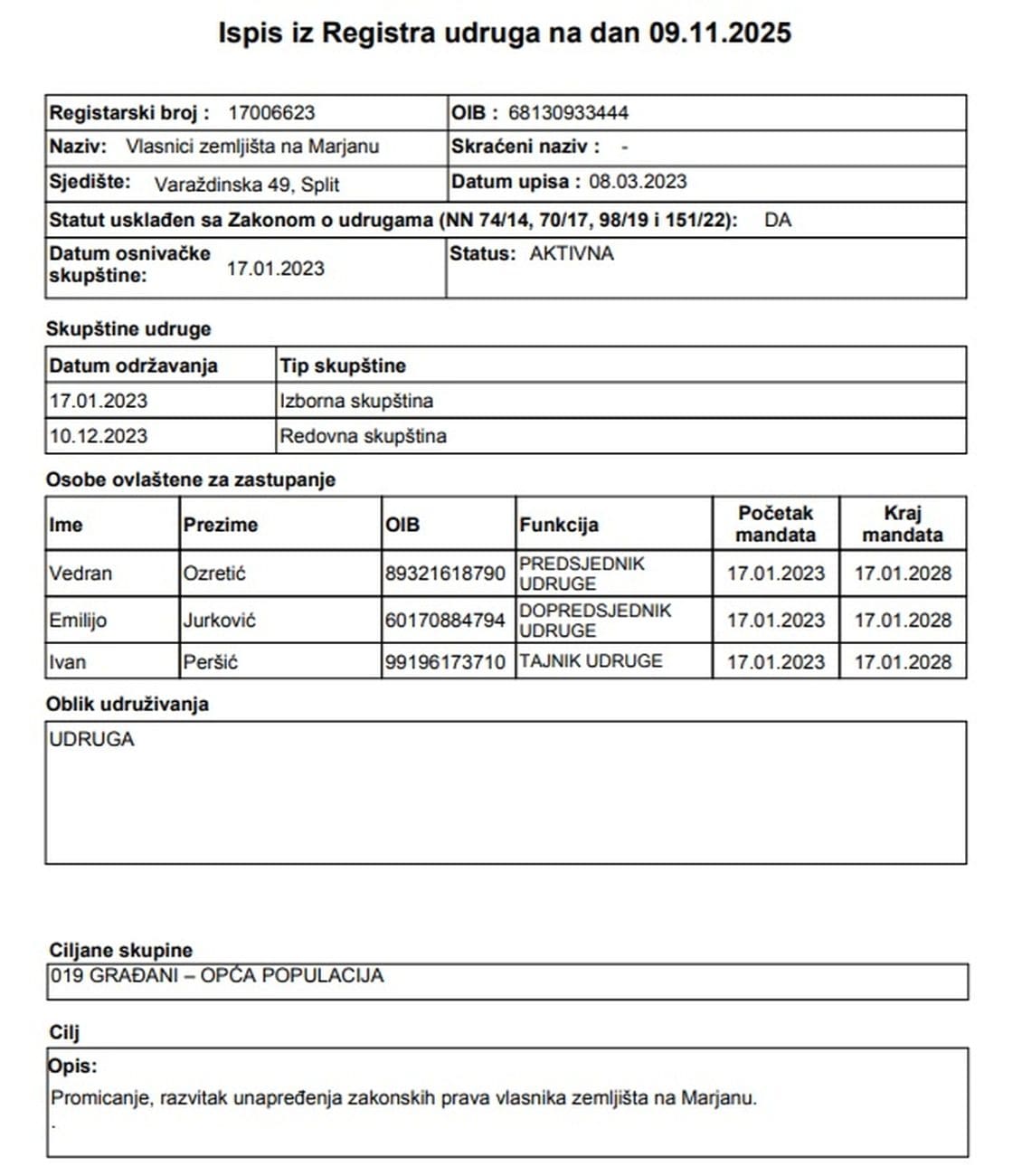 Želja udruge vlasnika zemljišta za isključenjem iz zaštite već je naišla na odbijanje. Visoki upravni sud RH (VUS) presudom iz 2024. godine odbio je zahtjev vlasnika zemljišta na Marjanu. Ovu je vijest prenio i sam portal Dalmacija Danas", rekao je Marinić za Dalmaciju Danas.