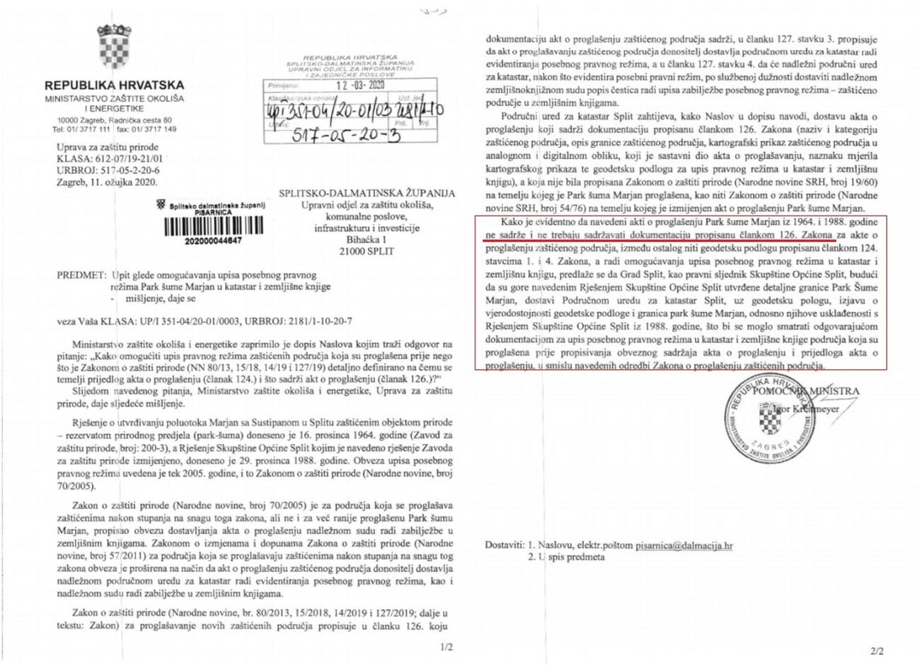 Kaže da su osnivački akti Park-šume Marjan iz 1964. i 1988. zakoniti i važeći, a Zakon o zaštiti prirode jamči kontinuitet zaštite!
