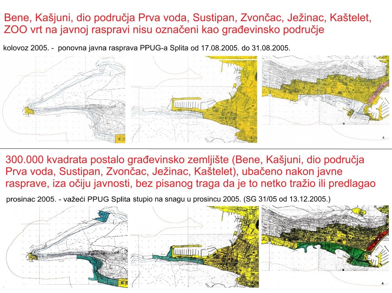 "Na ironične tvrdnje da 'samo Srđan Marinić' zna o ubacivanju 300.000 m² građevinskih zona na Marjanu, podsjećam javnost na nespornu činjenicu: te zone nisu bile označene kao građevinske zone tijekom javne rasprave o PPUG-u Splita. Ubačene su tek nakon završetka javne rasprave, a da ne postoji pisani trag da je to netko tražio. To znači da zainteresirana javnost nije mogla, za vrijeme javne rasprave, dati primjedbu protiv uvođenja 300.000 m² građevinskih zona unutar zaštićenog područja Park-šume Marjan. Nije bitno je li Udruga vlasnika zemljišta postojala u tom trenutku, već je bitno da dok postoje ta građevinska područja i dalje je to latentna opasnost za zaštitu Park-šume Marjan. Svakim danom odugovlačenja donošenja Izmjena i dopuna PPUG-a i GUP-a Splita, kojima se, između ostalog, to građevinsko područje drastično smanjuje, izravno se pogoduje onima koji žele graditi ili prodaju zemljište u građevinskom području Park-šume Marjan. U ovom trenutku oglašena je prodaja gotovo 10.000 građevinskih kvadrata u zaštićenom području Park-šume Marjan na predjelima Kašjuni i Prva voda. Park-šuma Marjan ne štiti se planiranjem građevinskih područja u njoj", otkriva te zaključuje: