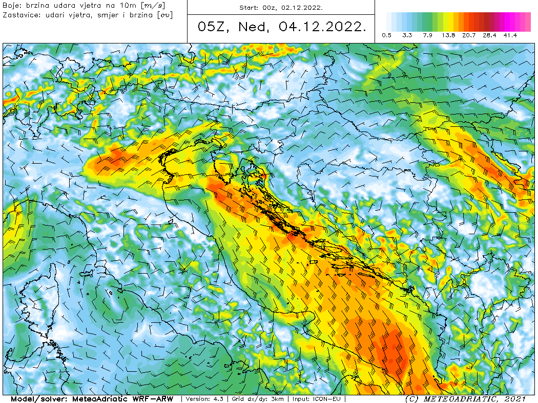 Dominantan vjetar na Jadranu bit će jugo koje će najjače biti krajem sljedećeg tjedna. Naime, od sredine sljedećeg tjedna vrlo hladna zračna masa s europskog sjeveroistoka zahvatit će područje Skandinavije, potom i britanskog otočja. Donijet će prave zimske vremenske (ne)prilike, no ista ta ciklona sa svoje prednje strane donositi će natprosječno visoke temperature zraka, oblake, južinu, kišu. Scenarij je to koji je sve samo ne poželjan za organizatore brojnih adventskih zbivanja.