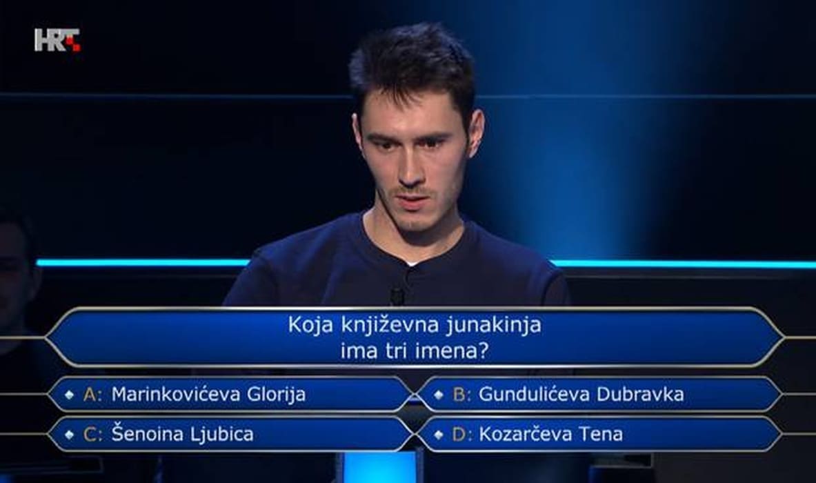 Među ponuđenim imenima bila je i Marinkovićeva Glorija, ujedno i točan odgovor, Šenoina Ljubica te Kozarčeva Tena. Mario je stoga nastup u 'Milijunašu' zaključio s osvojenih 1.000 kuna, prenosi 24 sata.