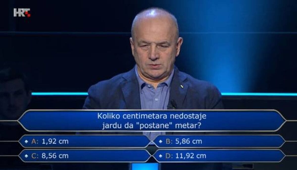 S istim iznosom otišao je i diplomirani inženjer elektrotehnike Dubravko Diklić. Naime, na pitanju za 8.000 kuna, u kojemu se tražio broj centimetara koji nedostaje jardu da 'postane' metar, mislio je kako je riječ o 5,86 cm.