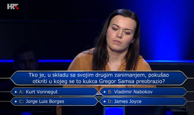 Od ponuđenih imena Kurta Vonneguta, Vladimira Nabokova, Jorgea Luisa Borgesa i Jamesa Joycea odabrala je Borgesovo ime, a ne Nabokova te je kviz napustila s 32.000 kuna, piše 24 sata.