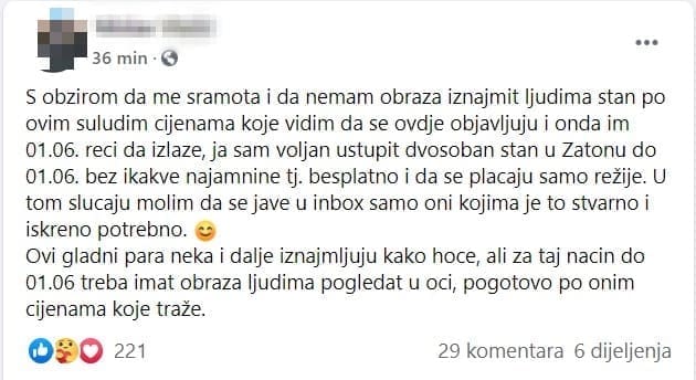 Kako je objavio u grupi, sram ga je iznajmljivati nekretninu po suludim cijenama pa će je stoga radije ustupiti besplatno.