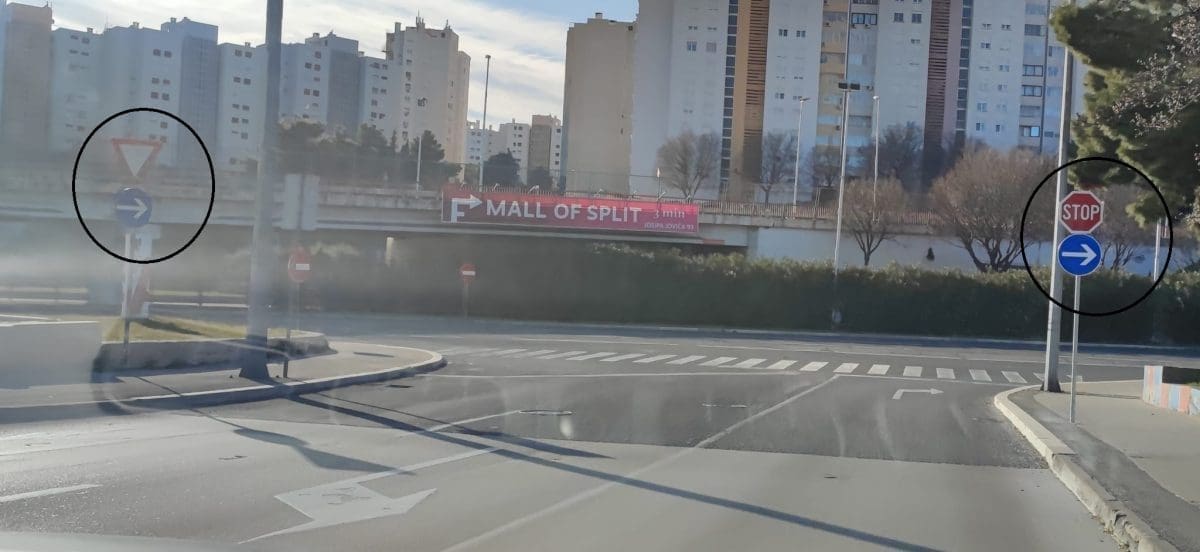 Opće je poznato da znak u obliku trokuta i "Stop" nemaju istu funkciju, pa nije jasno kako su se našli na istom mjestu.