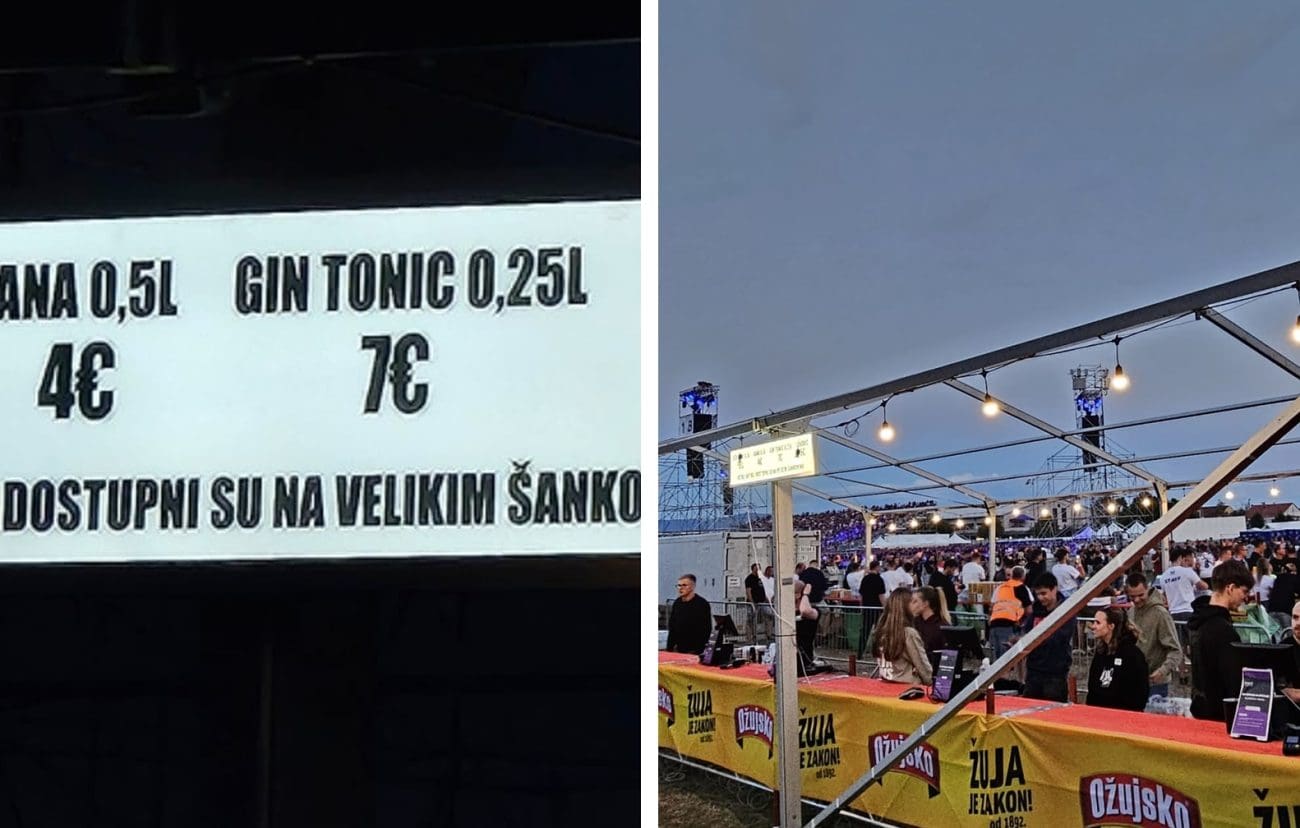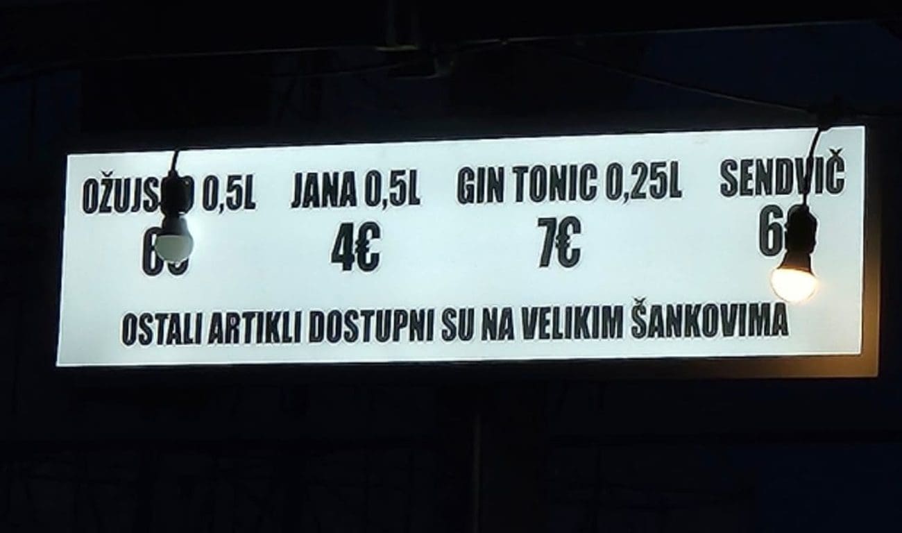 Ožujsko pivo (0.5L) prodaje se za 6 eura, Jana voda (0.5L) za 4 eura, gin tonic (0.25L) košta 7 eura, a sendvič 6 eura.